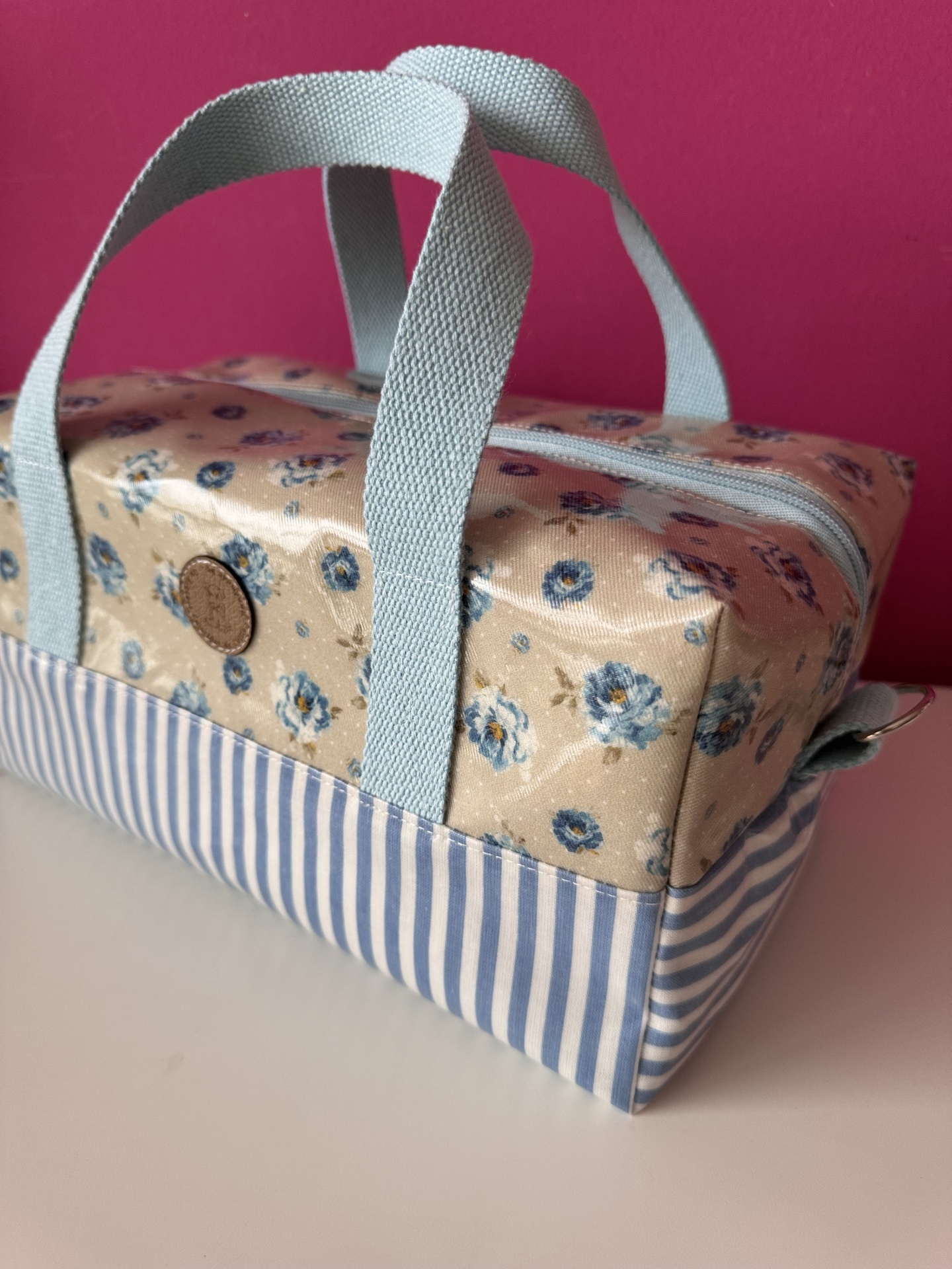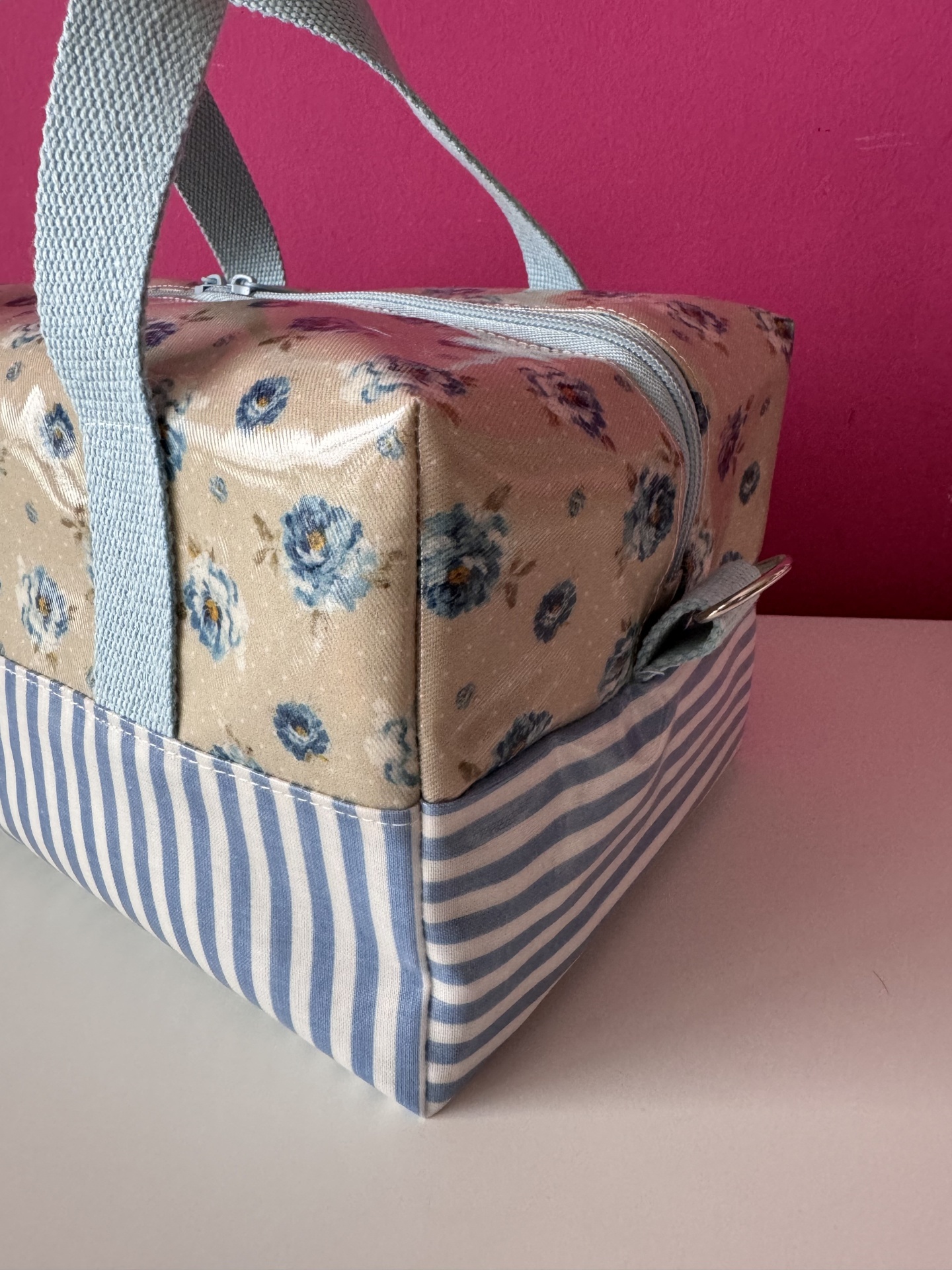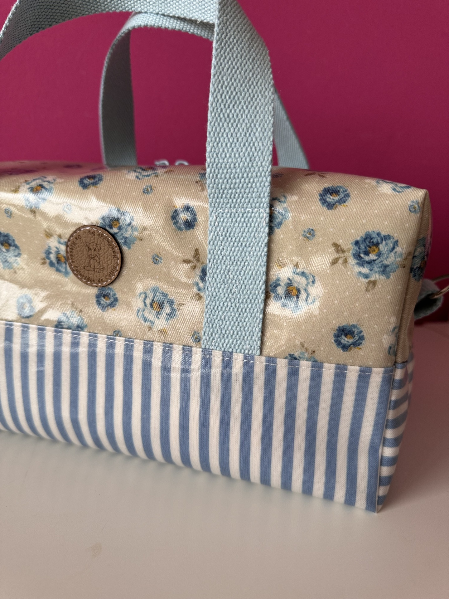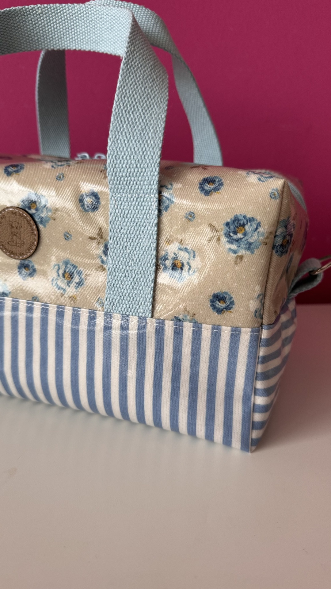 Elaborada com tecido plastificado e térmico de bolha (para que os alimentos se conservem durante mais tempo). Alças de percinta de algodão. Pode levar alça de ombro mediante indicação do cliente. (Valor da alça não incluído no preço apresentado)