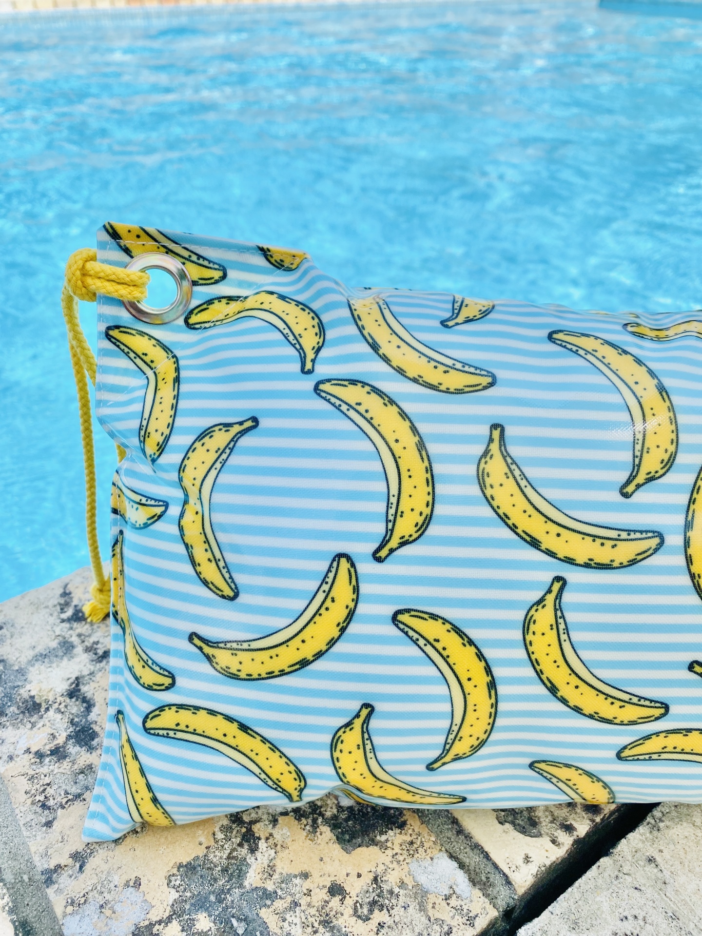Almofada de praia em tecido plastificado, com cordão para transportar ou pendurar.