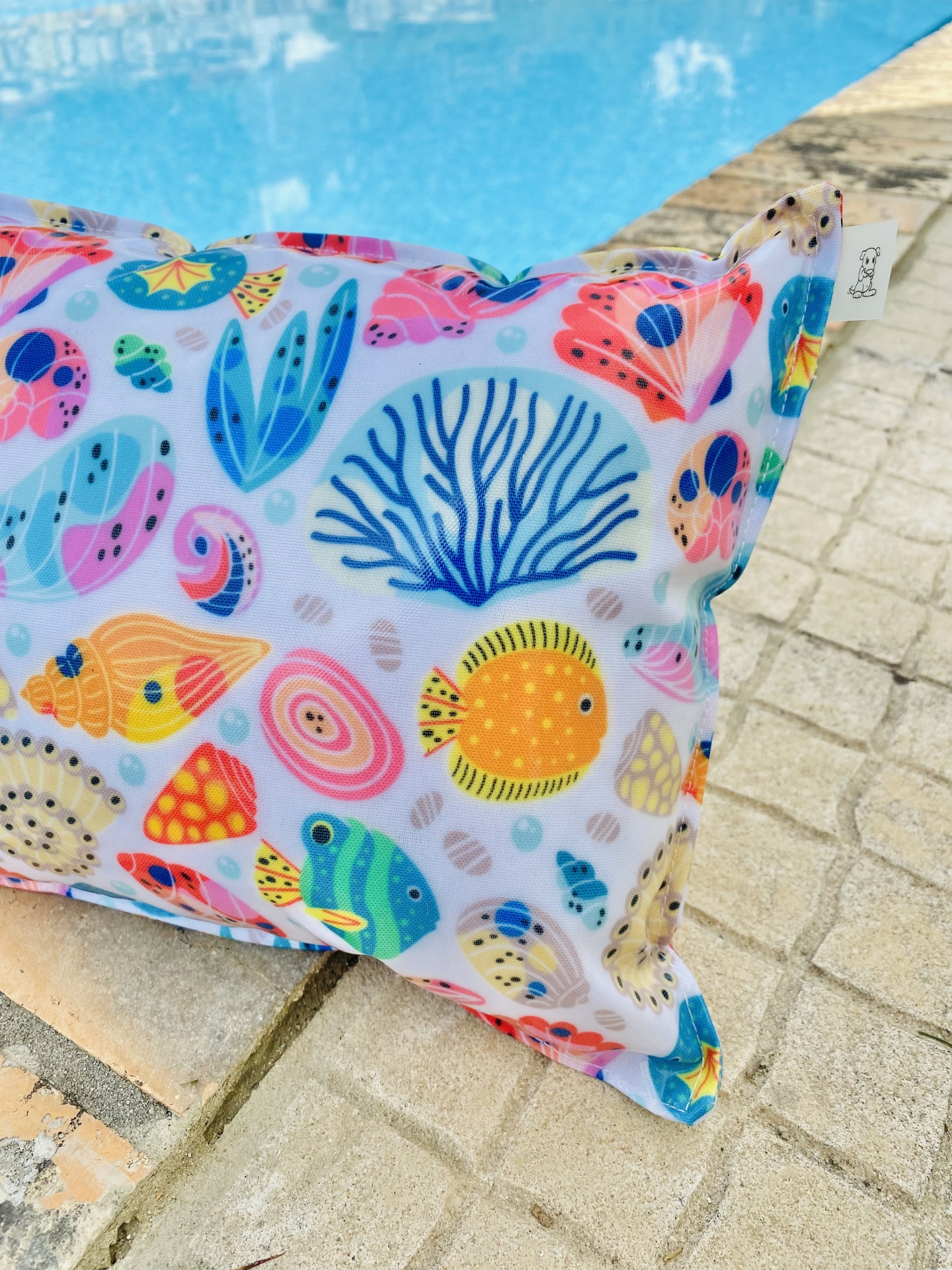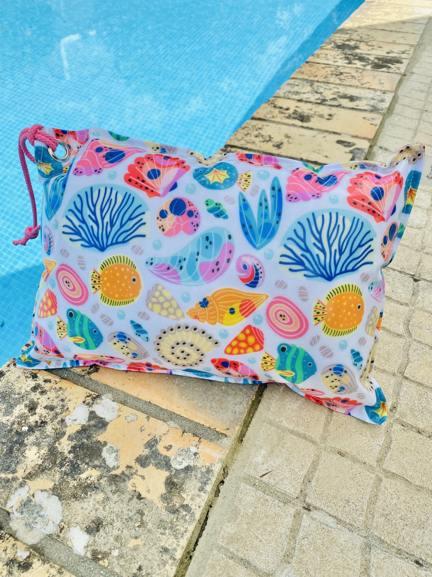 Almofada de praia em tecido plastificado, com cordão para transportar ou pendurar.