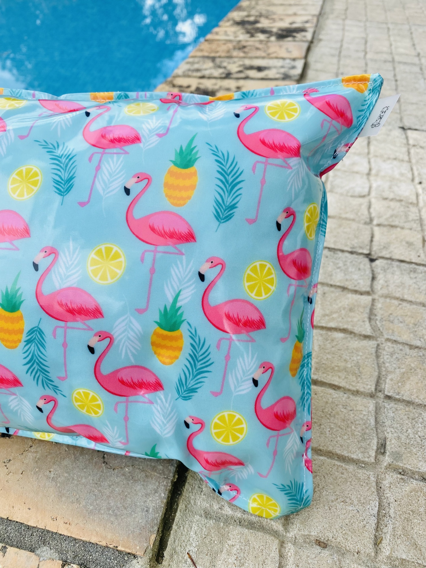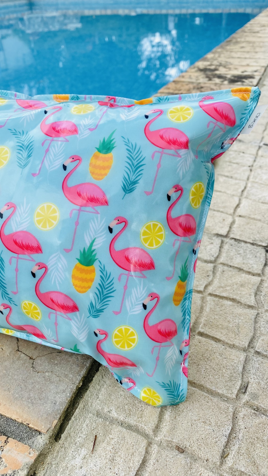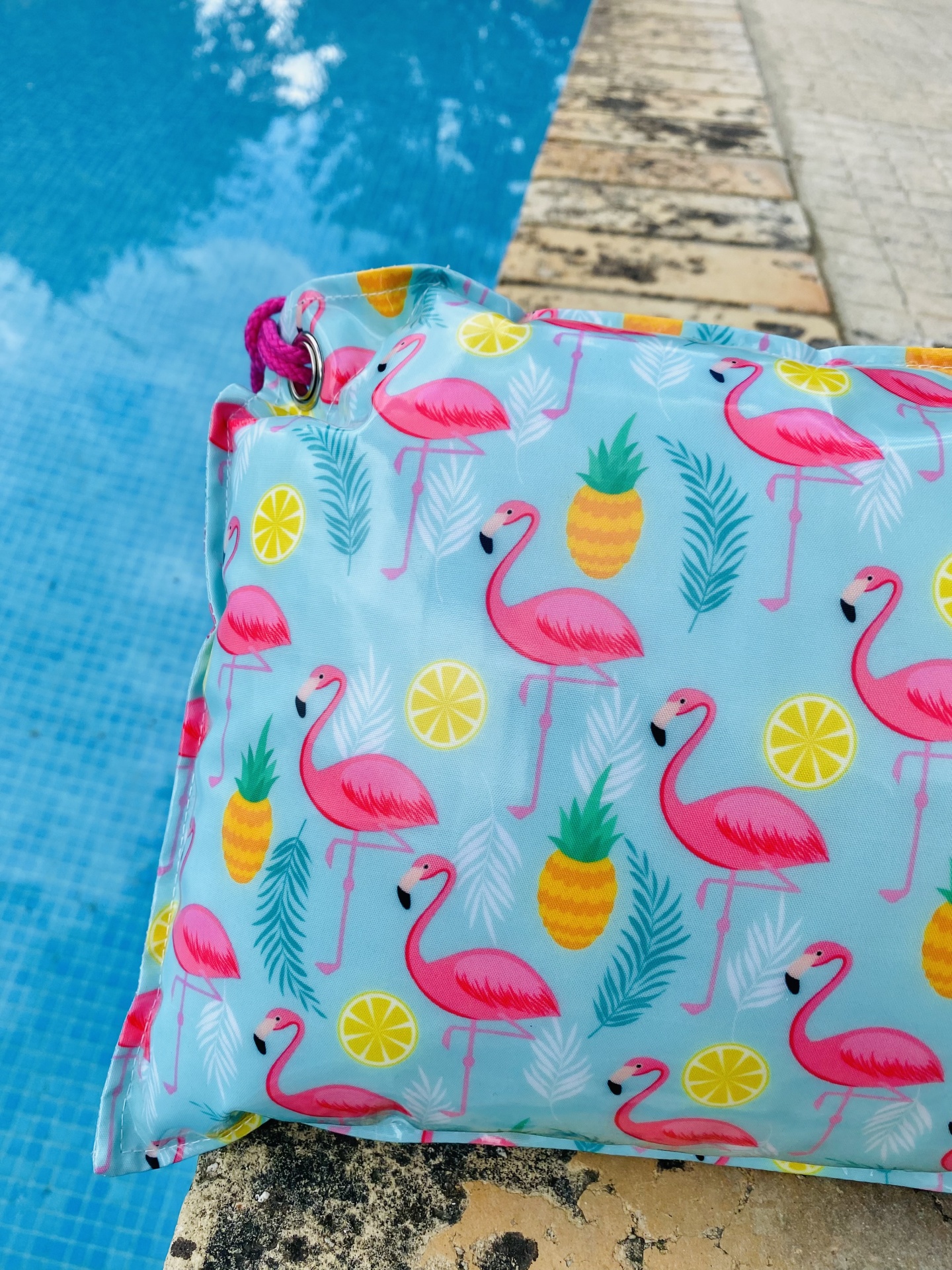Almofada de praia em tecido plastificado, com cordão para transportar ou pendurar.