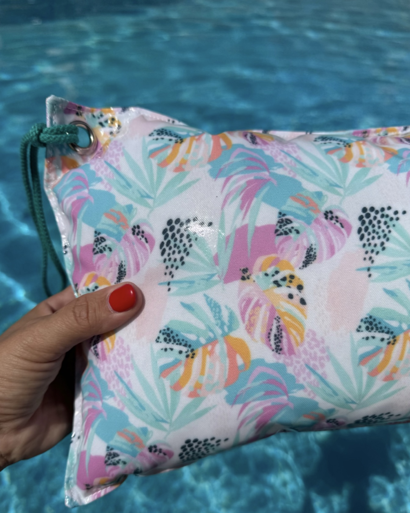 Almofada de praia em tecido plastificado, com cordão para transportar ou pendurar.