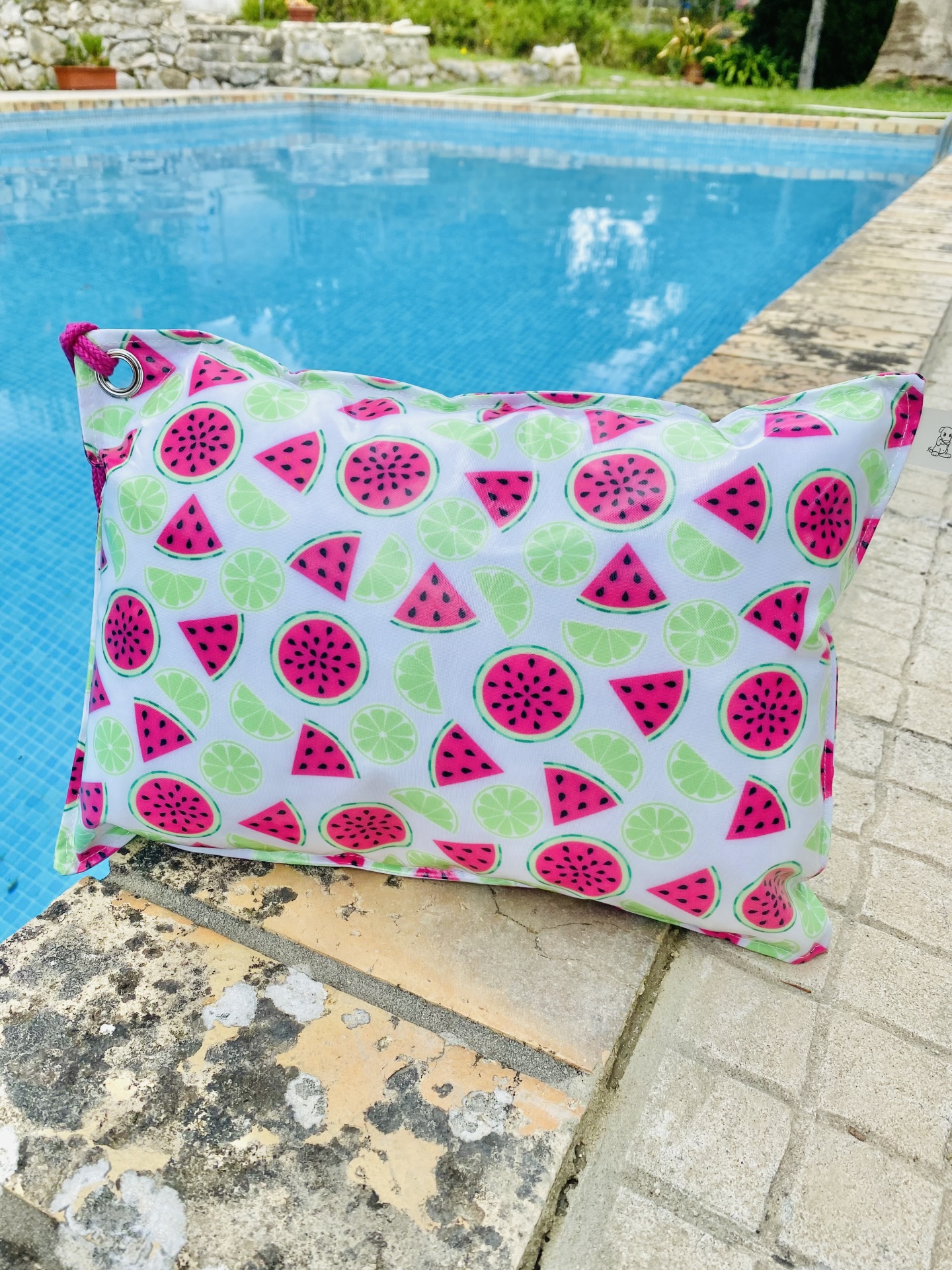 Almofada de praia em tecido plastificado, com cordão para transportar ou pendurar.