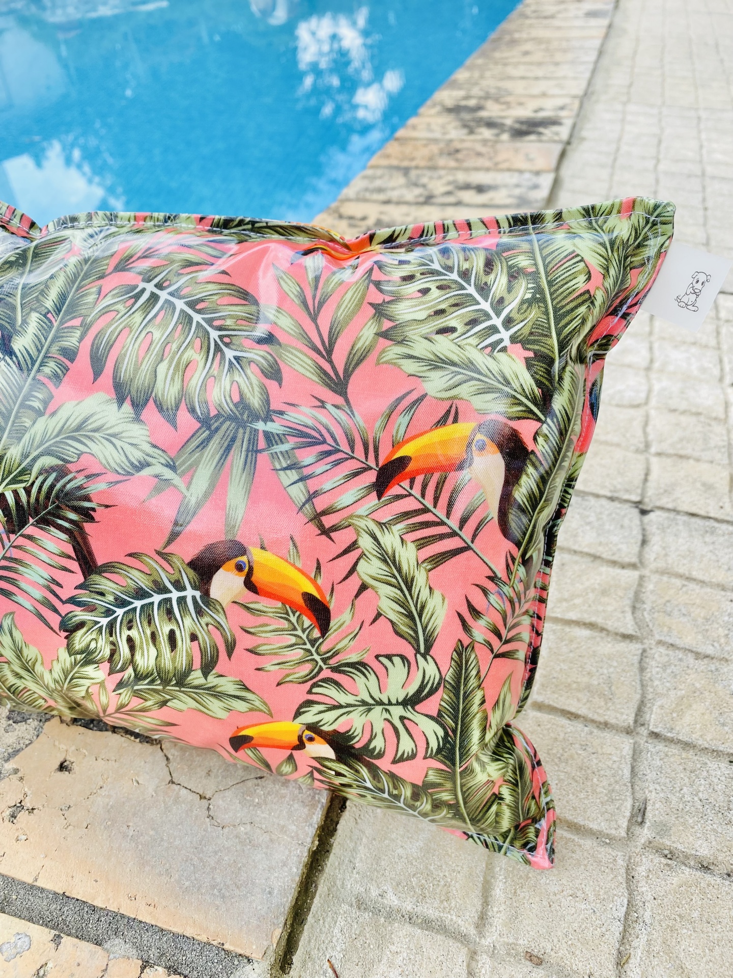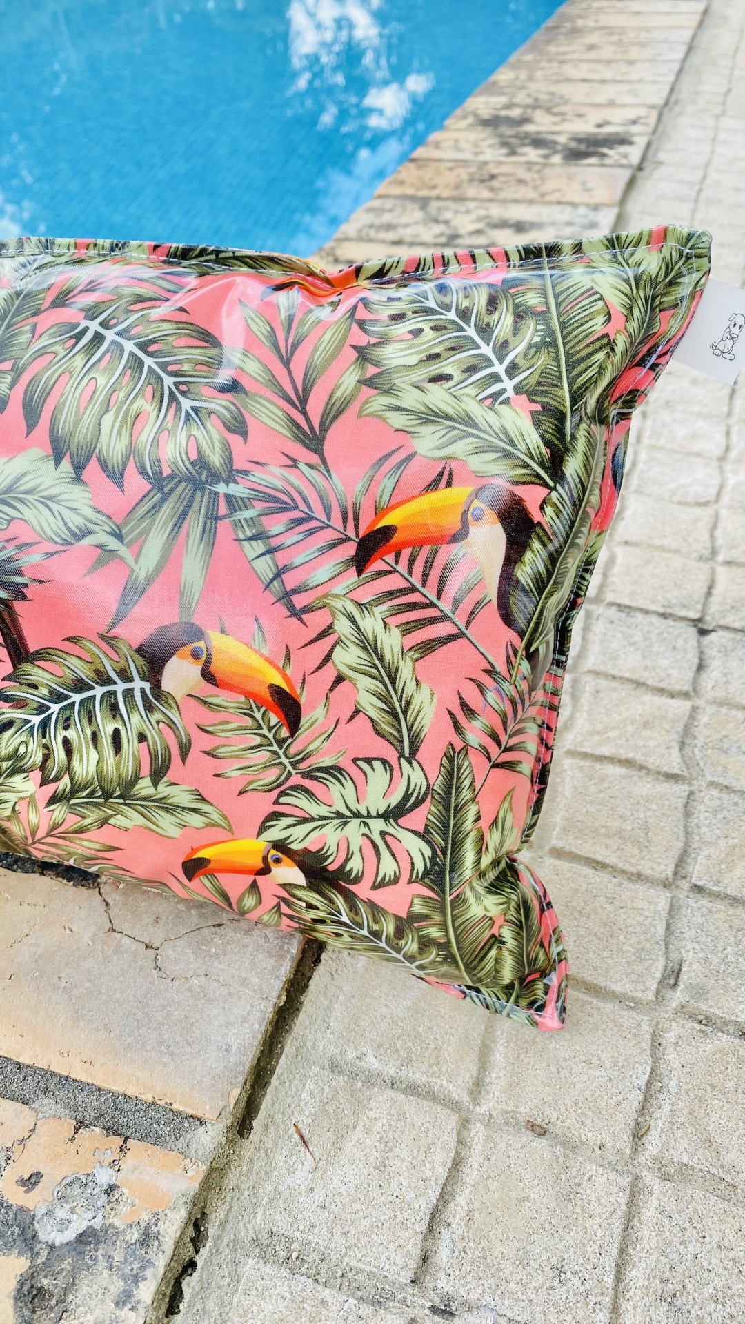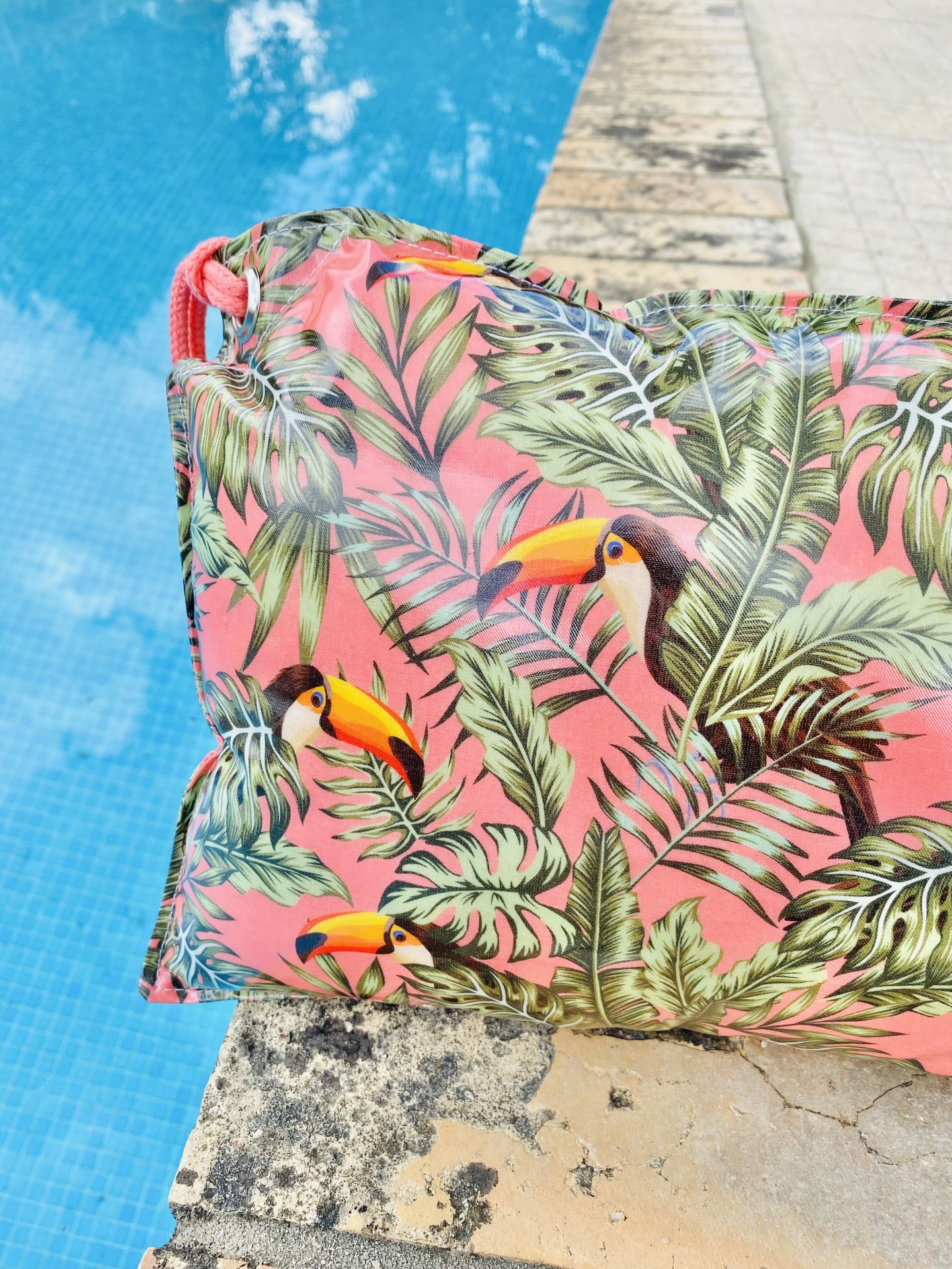 Almofada de praia em tecido plastificado, com cordão para transportar ou pendurar.