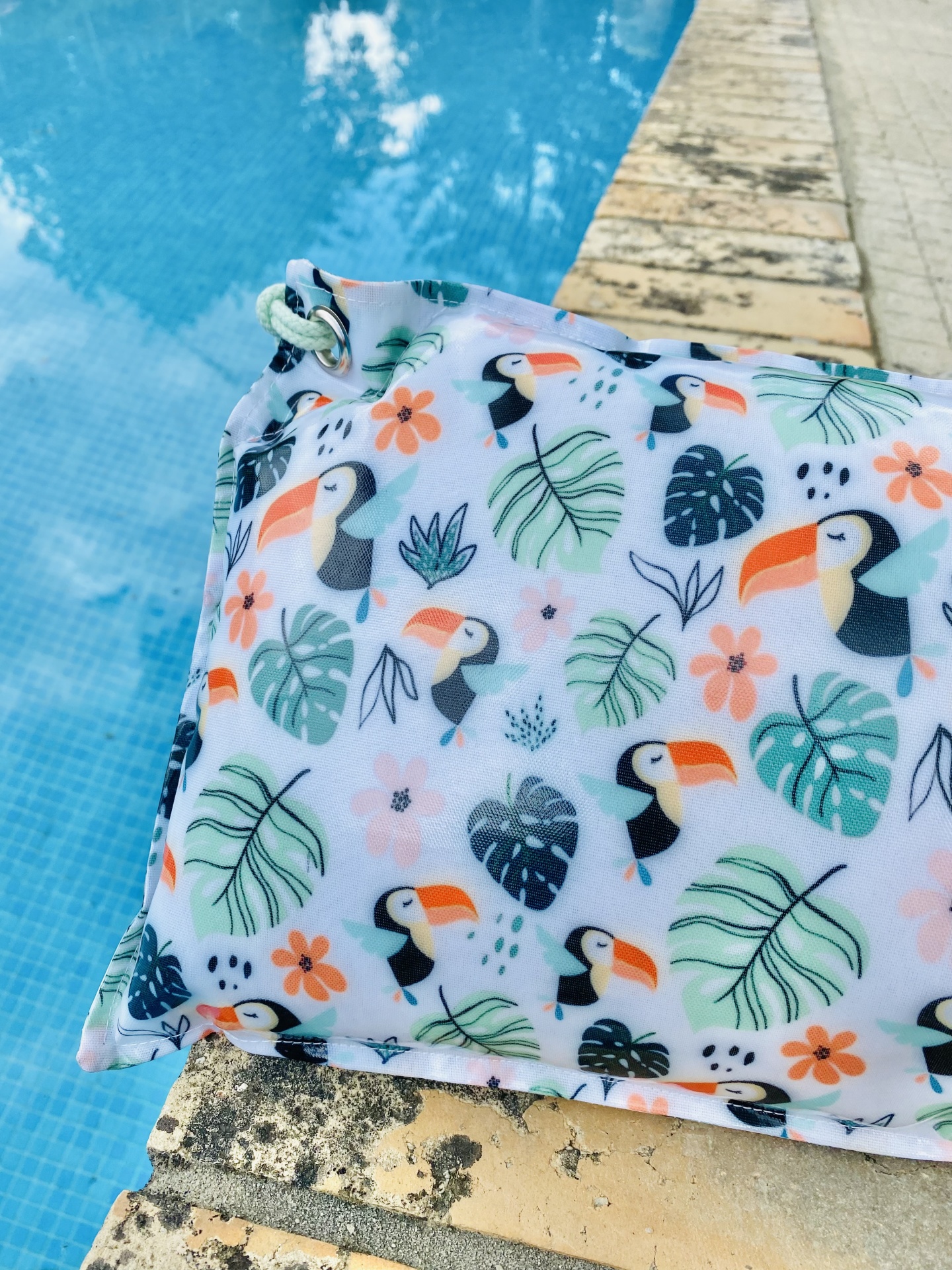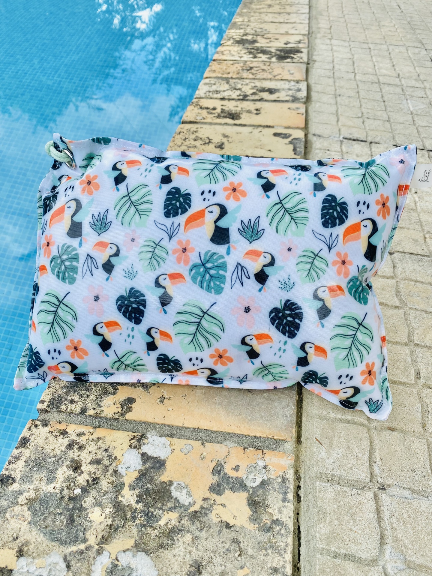 Almofada de praia em tecido plastificado, com cordão para transportar ou pendurar.