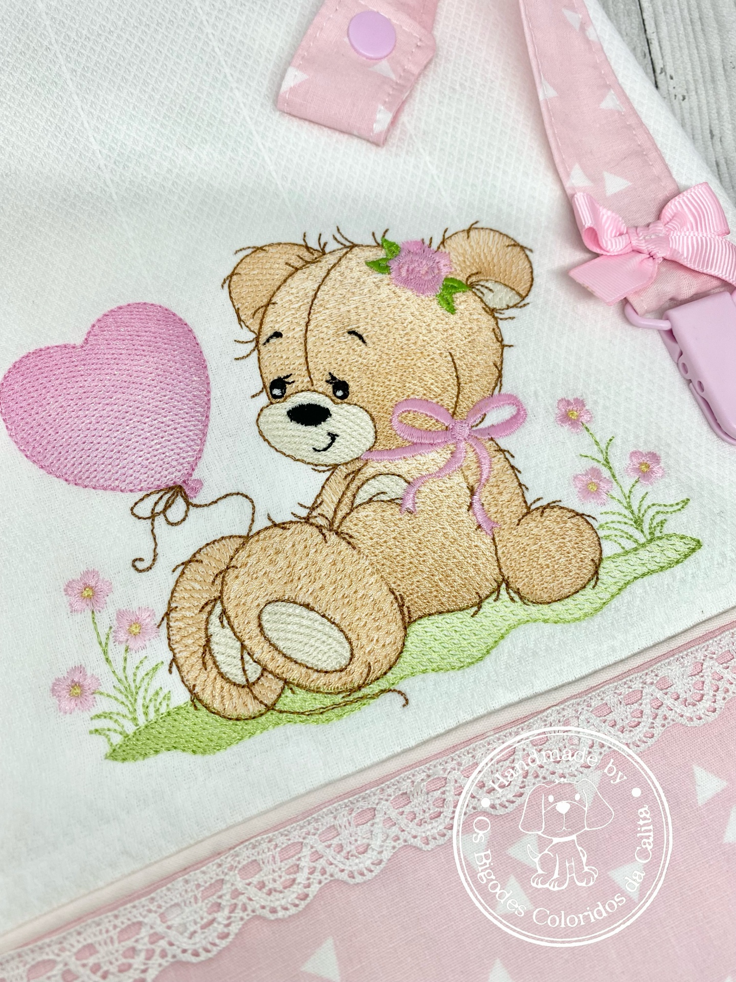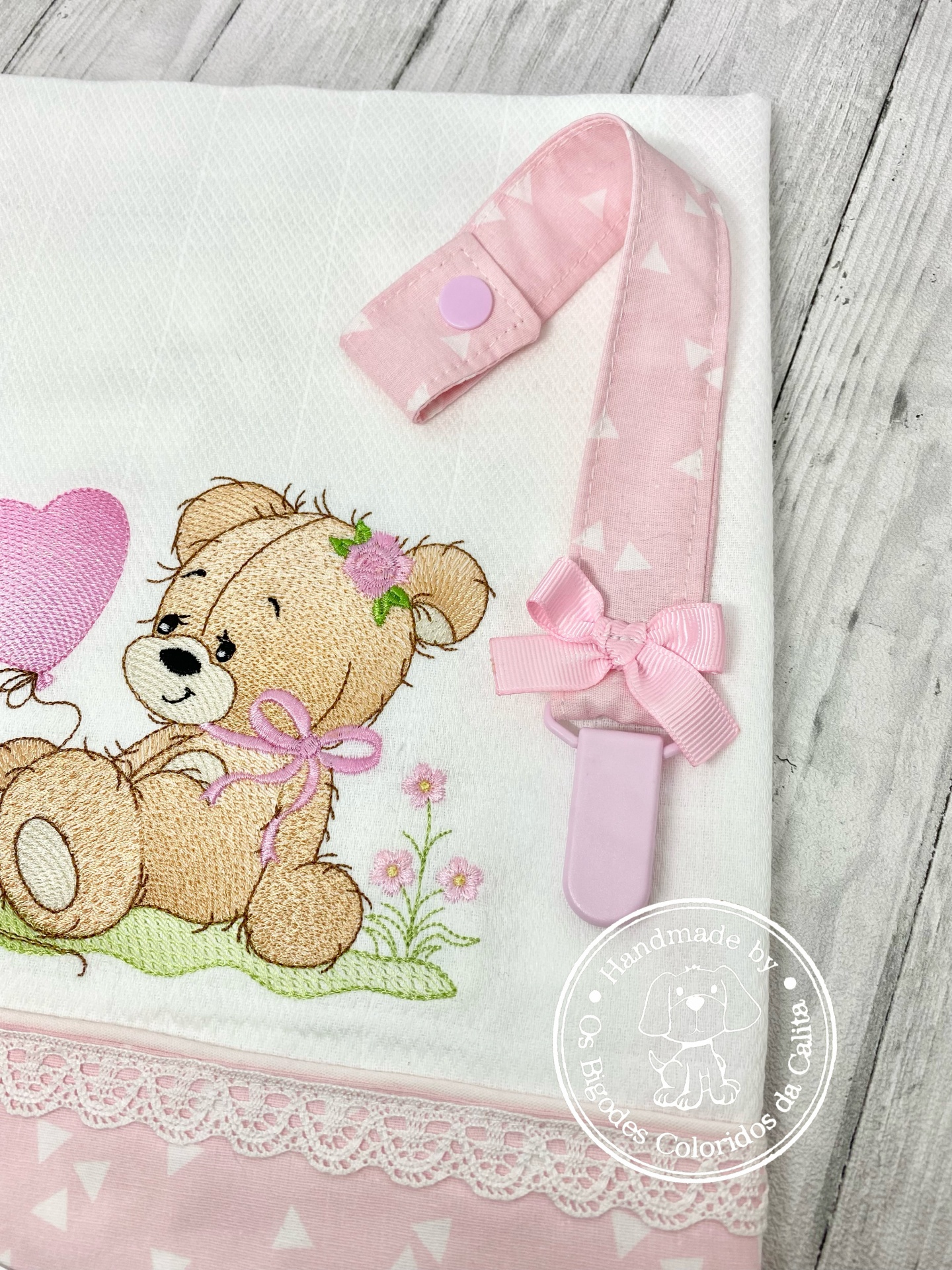 Conjunto composto por fralda de algodão bordada e prende chucha.