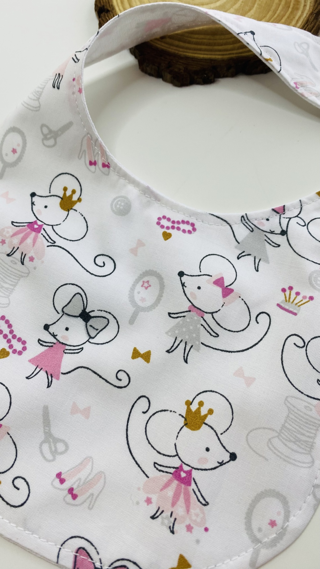 Babetes em tecido de algodão e jersey plastificado.