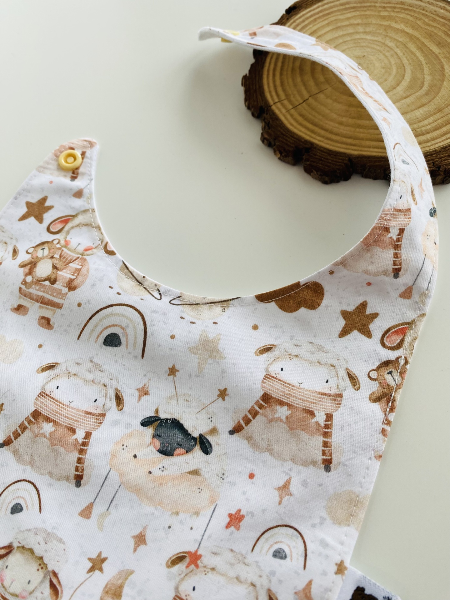 Babetes em tecido de algodão e jersey plastificado.