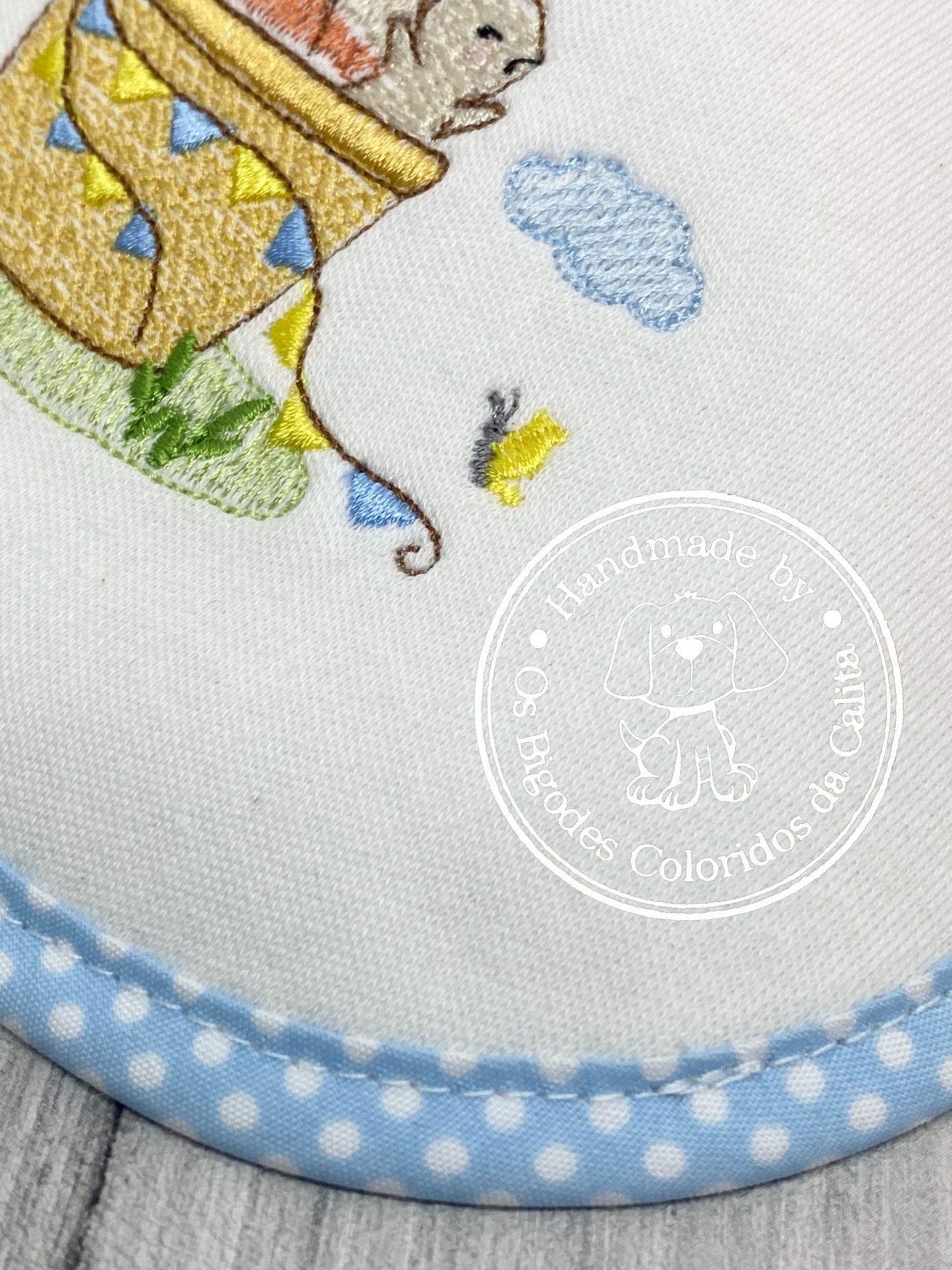 Babete bordado. Feito em jersey e jersey plastificado, óptimo material para absorção e ao mesmo tempo não permite a passagem da humidade, mantendo assim o bebé sempre seco.