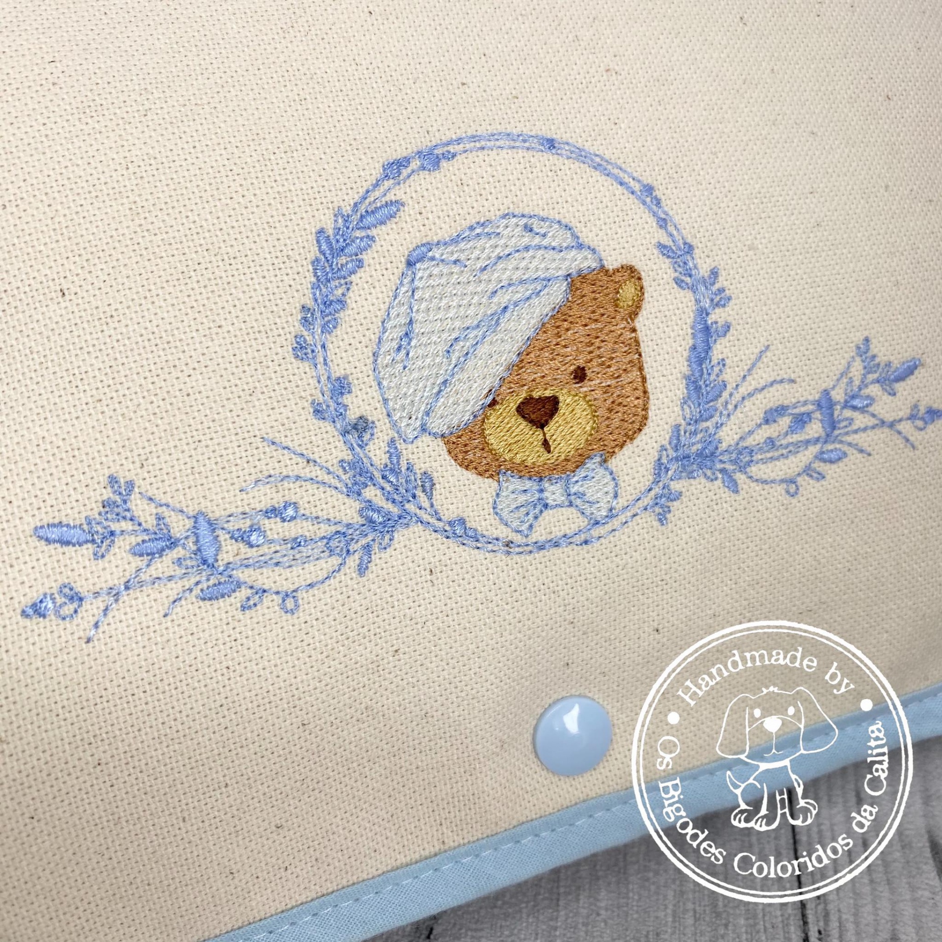 Bolsa de criança que permite transportar as fraldas, os toalhetes e o creme do bebé, para além de outras coisas extra. Tecidod de algodão, linho alentejano bordado, rede e tela plastificada.