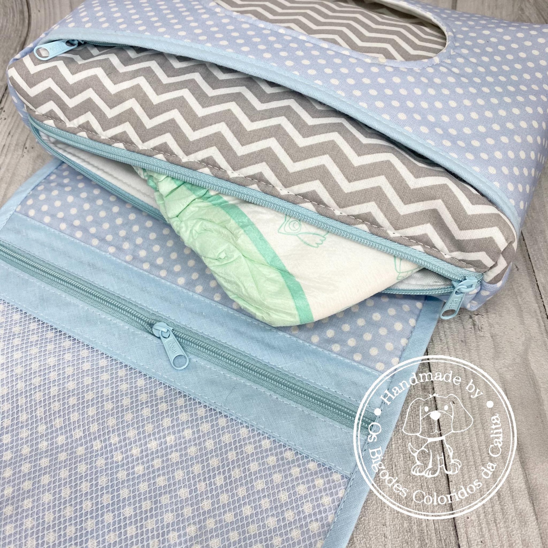 Três zonas com fechos (toalhetes, fraldas e um zona de rede mesh para compressas ou soro fisiológico). Na zona do toalhetes o interior é com tela plastificada.