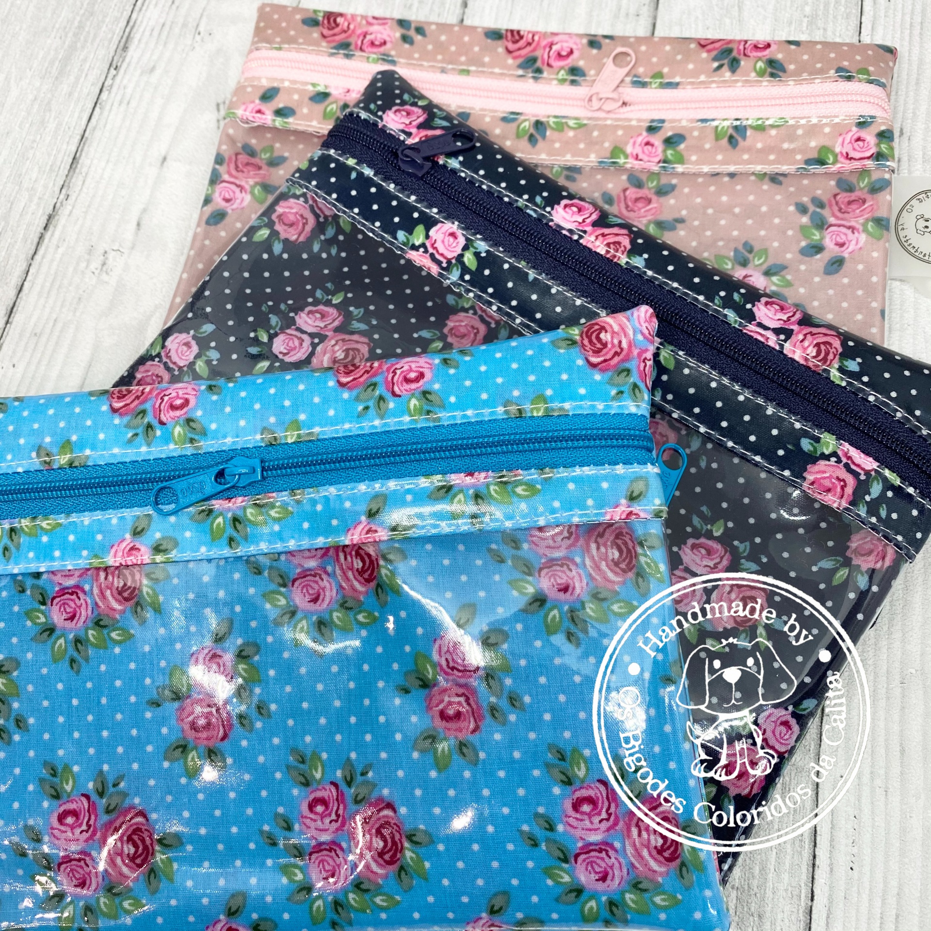 Bolsas plastificadas com medida de 19x13cm. Dois bolsos com fecho; um deles com plástico transparente de modo a que possa usar (por ex.) o telemóvel sem ter de o retirar.