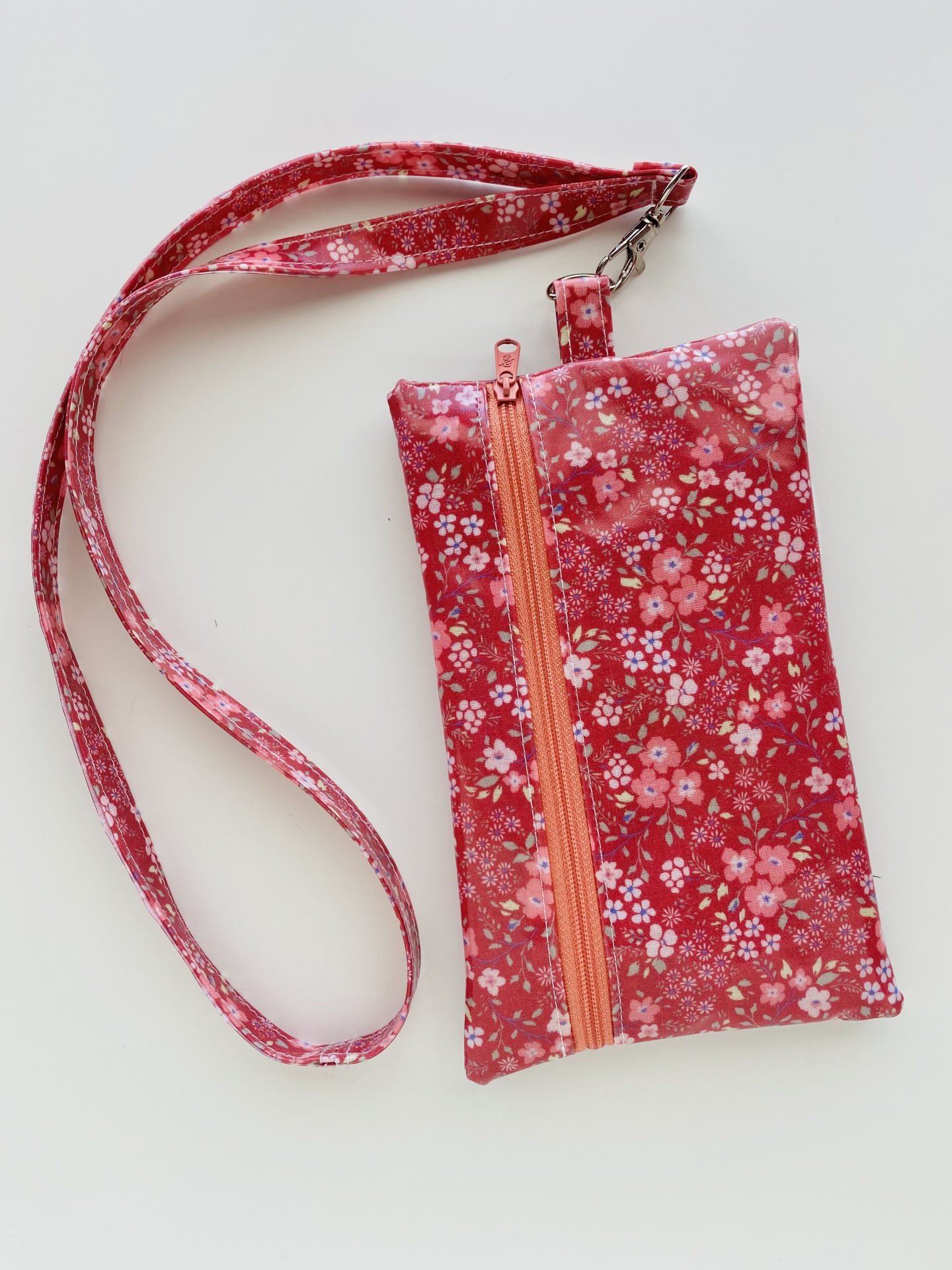 Bolsa de telemóvel em tecido plastificado. Dois bolsos com fecho: um deles com plástico cristal (possível de usar o telemóvel sem ter de o retirar da bolsa) e outra nas costas. Fita para colocar ao pescoço.