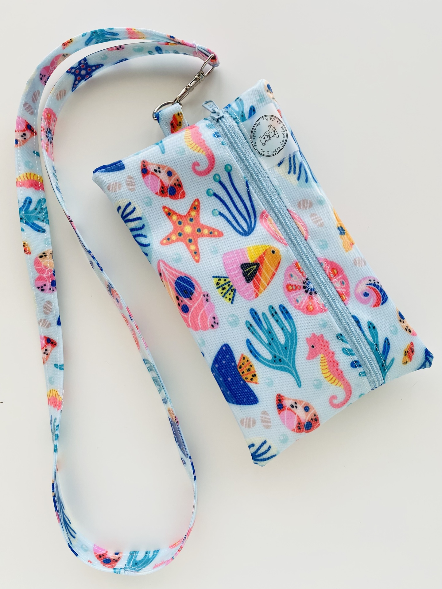 Bolsa de telemóvel em tecido plastificado. Dois bolsos com fecho: um deles com plástico cristal (possível de usar o telemóvel sem ter de o retirar da bolsa) e outra nas costas. Fita para colocar ao pescoço.