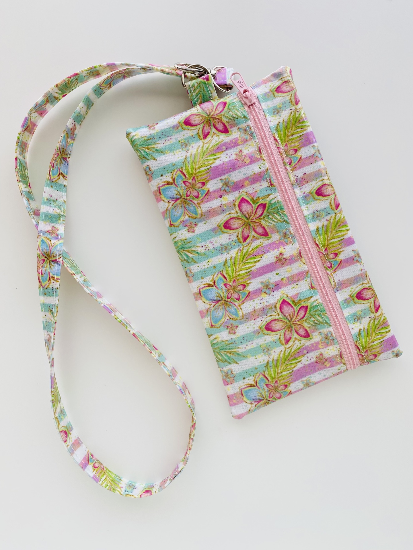 Bolsa de telemóvel em tecido plastificado. Dois bolsos com fecho: um deles com plástico cristal (possível de usar o telemóvel sem ter de o retirar da bolsa) e outra nas costas. Fita para colocar ao pescoço.