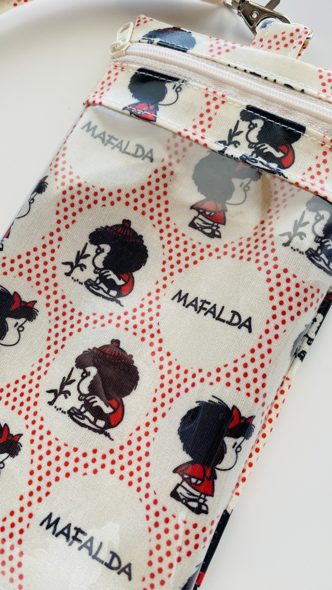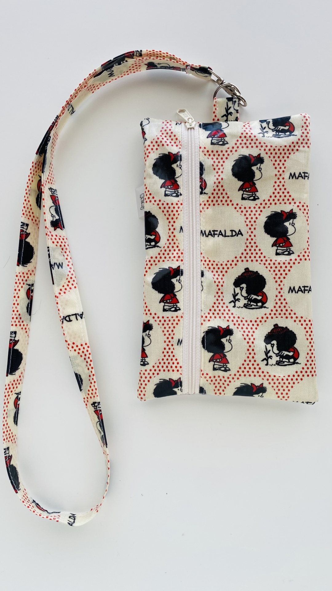 Bolsa de telemóvel em tecido plastificado. Dois bolsos com fecho: um deles com plástico cristal (possível de usar o telemóvel sem ter de o retirar da bolsa) e outra nas costas. Fita para colocar ao pescoço.