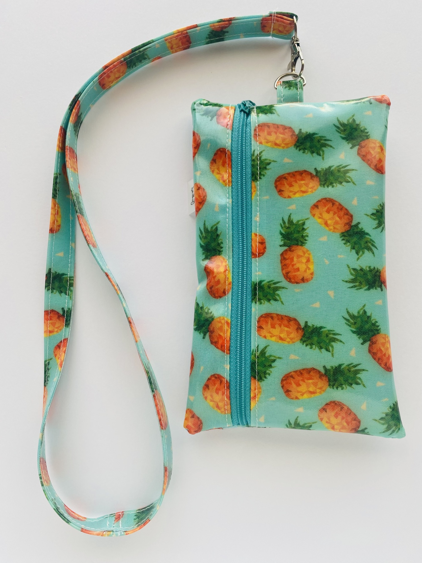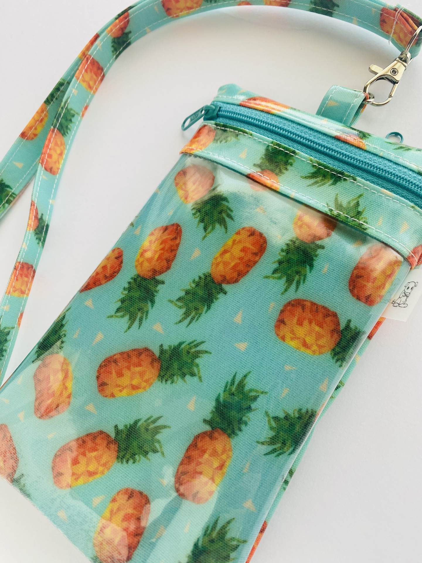 Bolsa de telemóvel em tecido plastificado. Dois bolsos com fecho: um deles com plástico cristal (possível de usar o telemóvel sem ter de o retirar da bolsa) e outra nas costas.