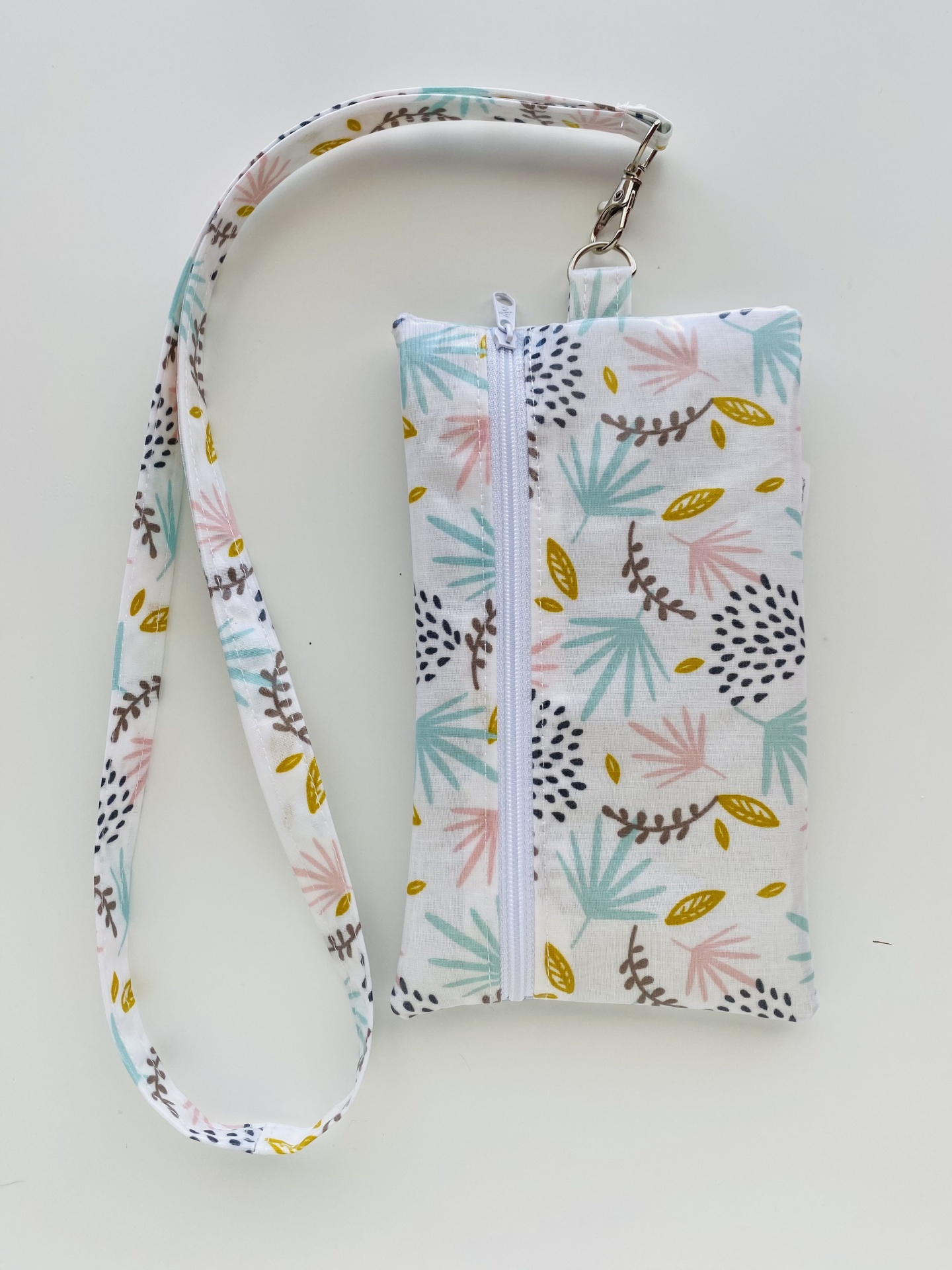 Bolsa de telemóvel em tecido plastificado. Dois bolsos com fecho: um deles com plástico cristal (possível de usar o telemóvel sem ter de o retirar da bolsa) e outra nas costas. Fita para colocar ao pescoço.