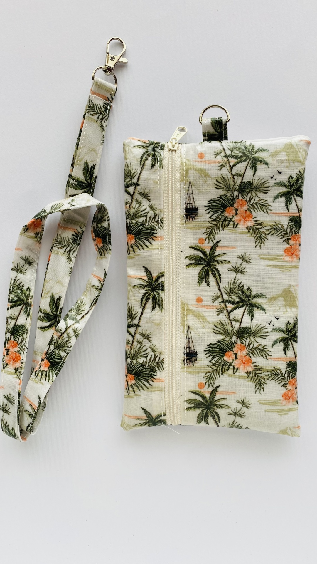 Bolsa de telemóvel em tecido plastificado. Dois bolsos com fecho: um deles com plástico cristal (possível de usar o telemóvel sem ter de o retirar da bolsa) e outra nas costas.