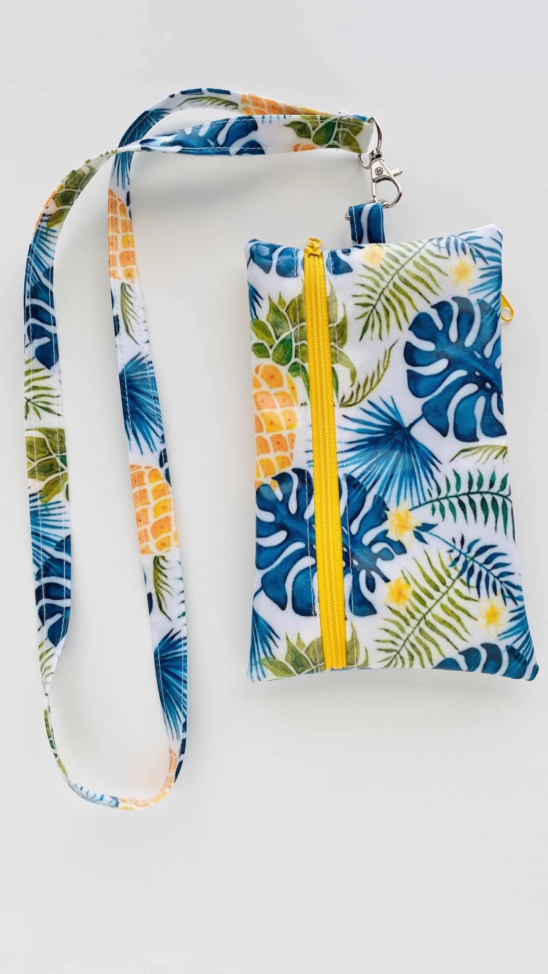 Bolsa de telemóvel em tecido plastificado. Dois bolsos com fecho: um deles com plástico cristal (possível de usar o telemóvel sem ter de o retirar da bolsa) e outra nas costas.