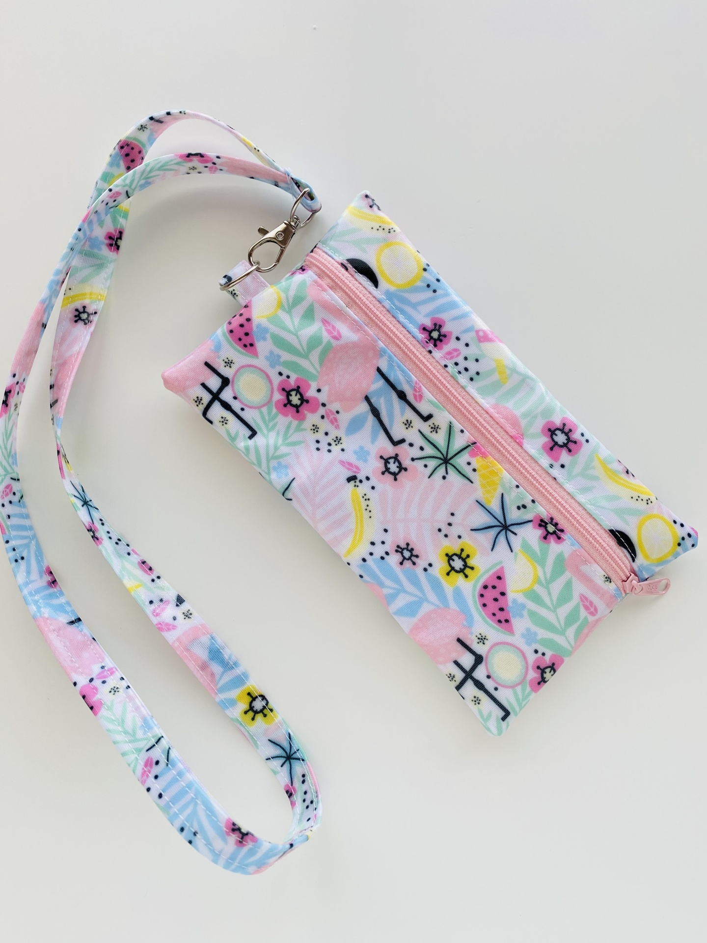 Bolsa de telemóvel em tecido plastificado. Dois bolsos com fecho: um deles com plástico cristal (possível de usar o telemóvel sem ter de o retirar da bolsa) e outra nas costas. Fita para colocar ao pescoço.