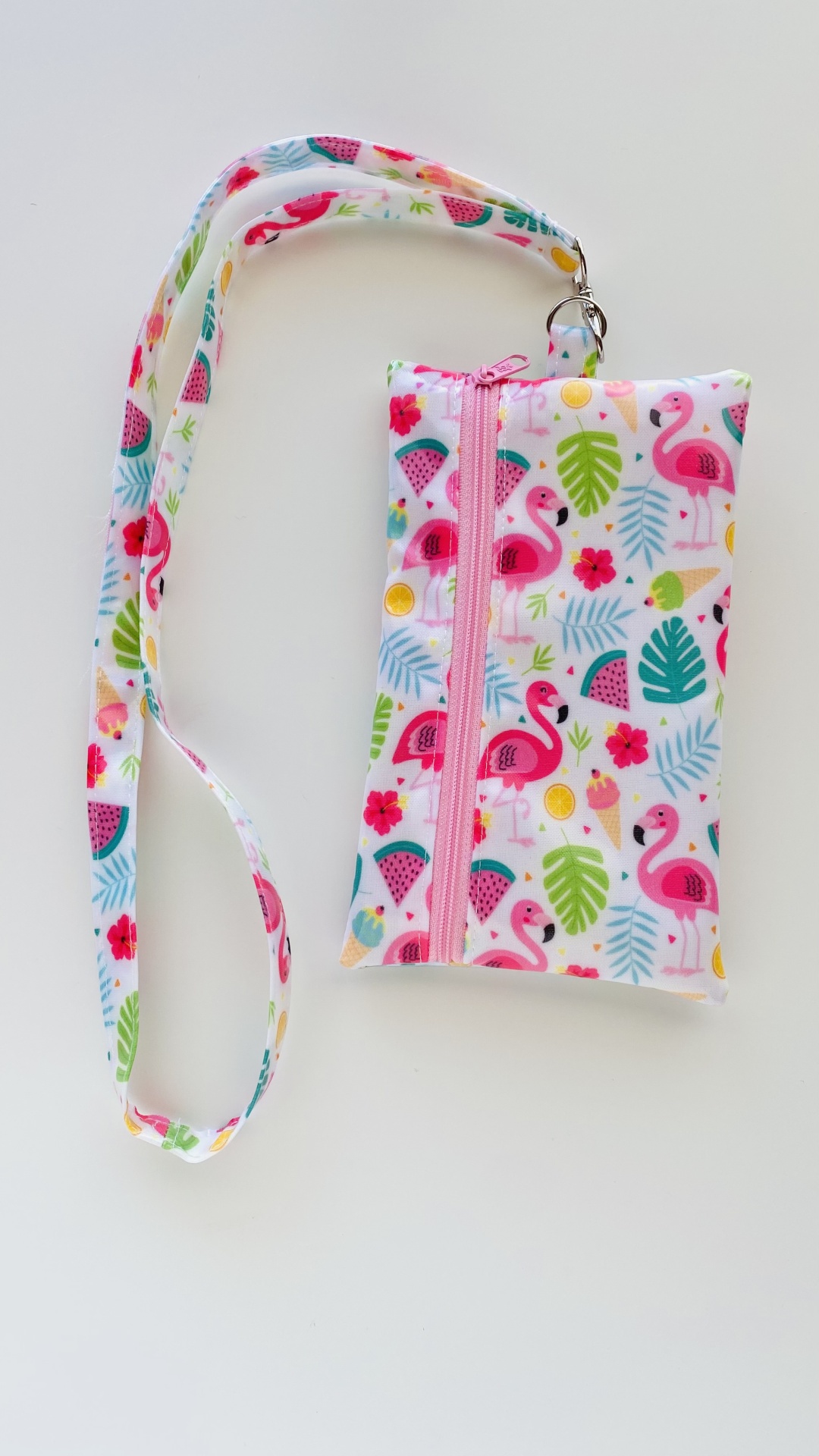 Bolsa de telemóvel em tecido plastificado. Dois bolsos com fecho: um deles com plástico cristal (possível de usar o telemóvel sem ter de o retirar da bolsa) e outra nas costas. Fita para colocar ao pescoço.