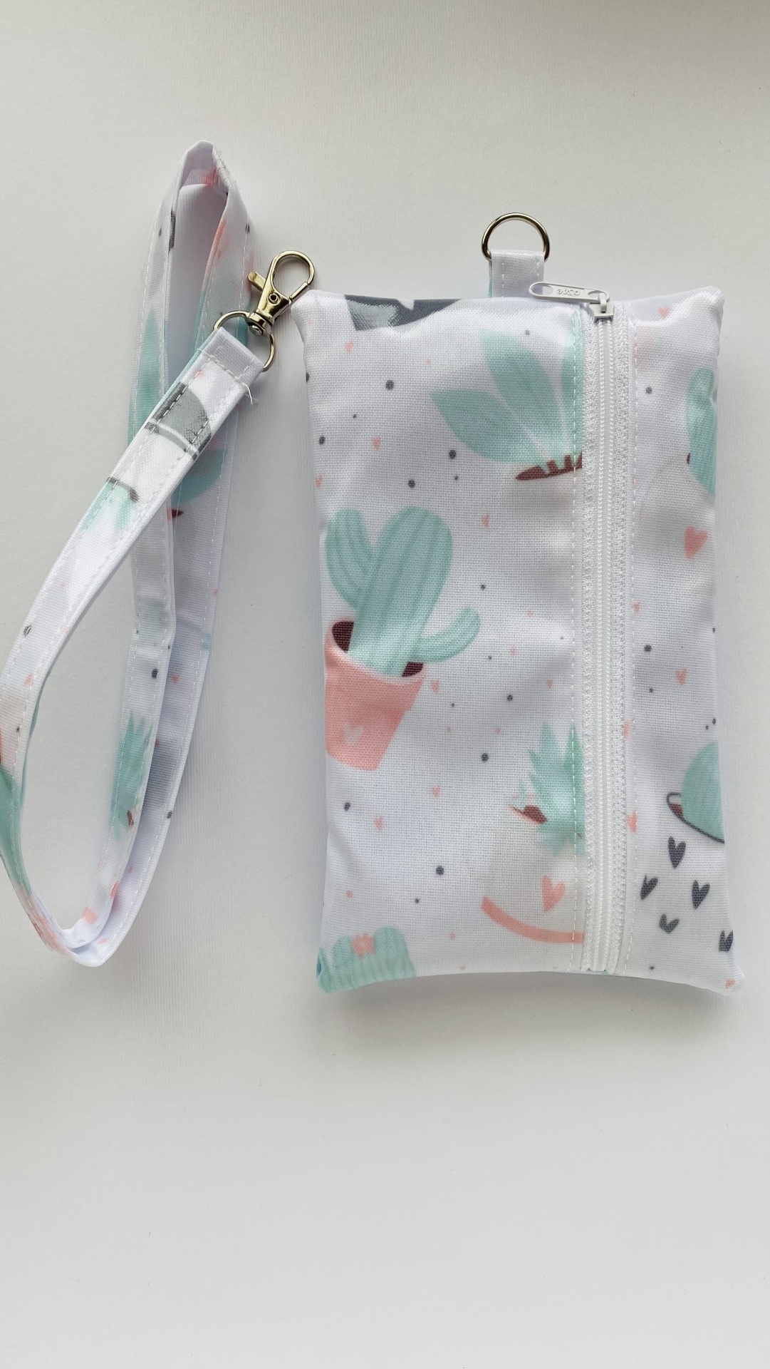 Bolsa de telemóvel em tecido plastificado. Dois bolsos com fecho: um deles com plástico cristal (possível de usar o telemóvel sem ter de o retirar da bolsa) e outra nas costas.