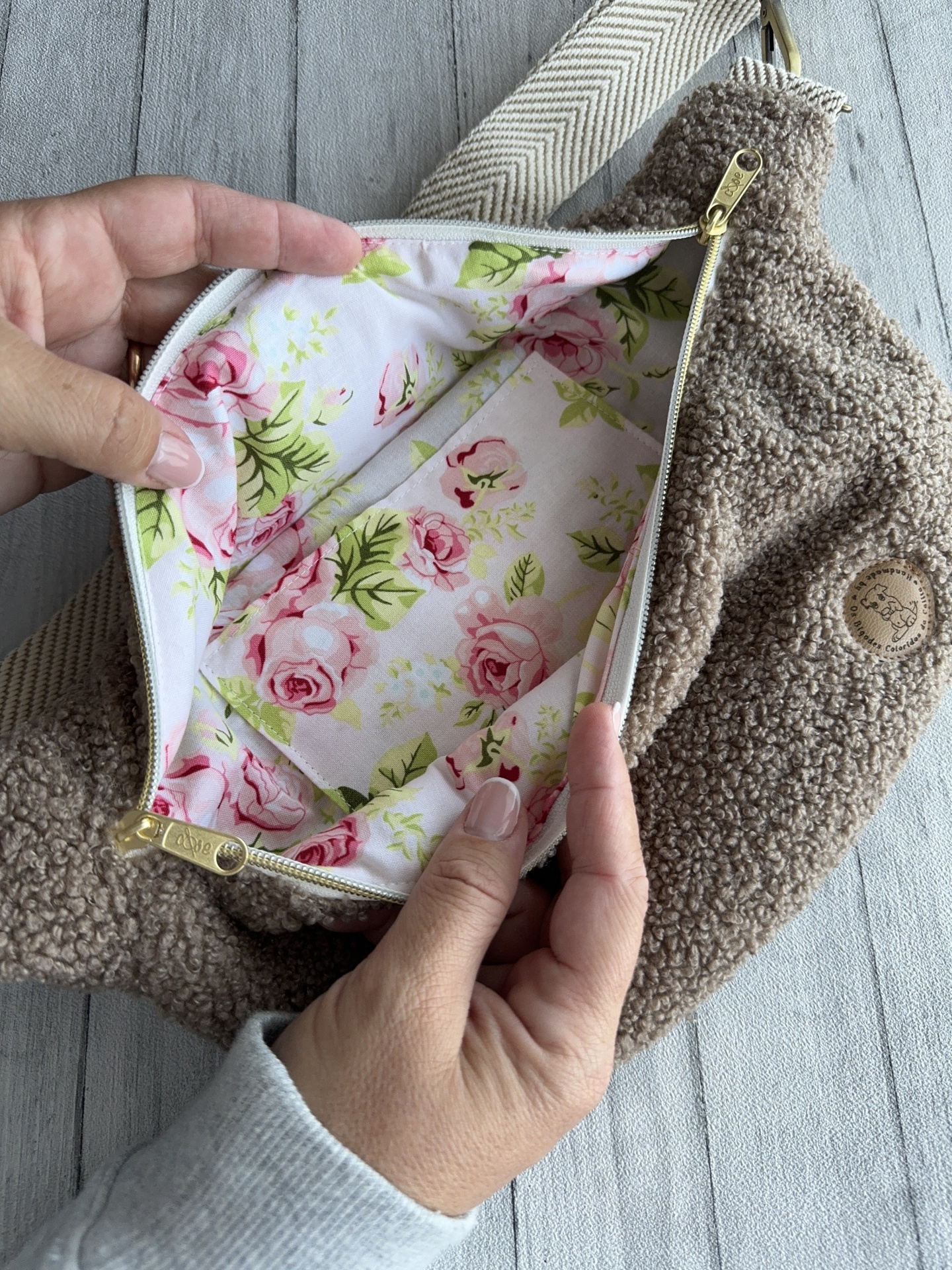 São feitas de pelúcia ursinho (teddy) e de algodão. Com um zíper no comprimento total da bolsa, dando-lhe uma abertura excelente. No interior tem um bolso, para ajudar a separar algo como uma chaves ou cartões ou qualquer outra coisa.