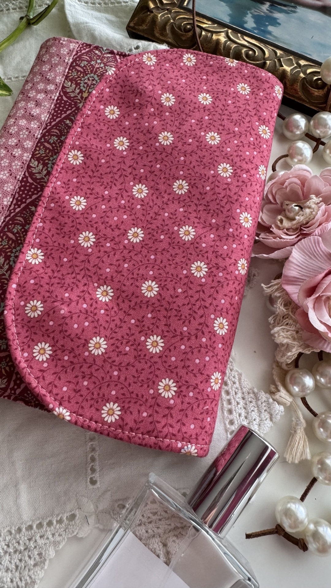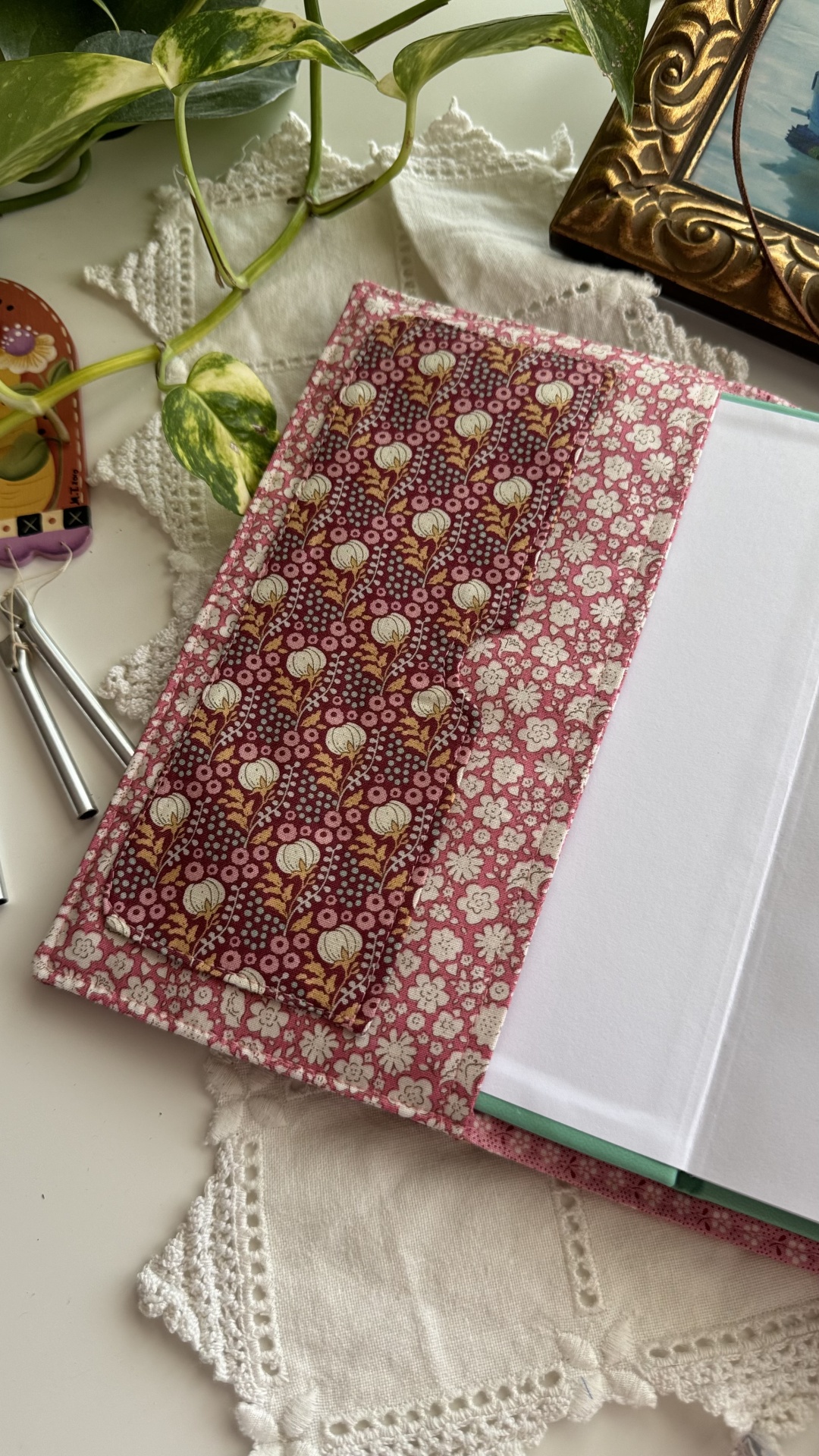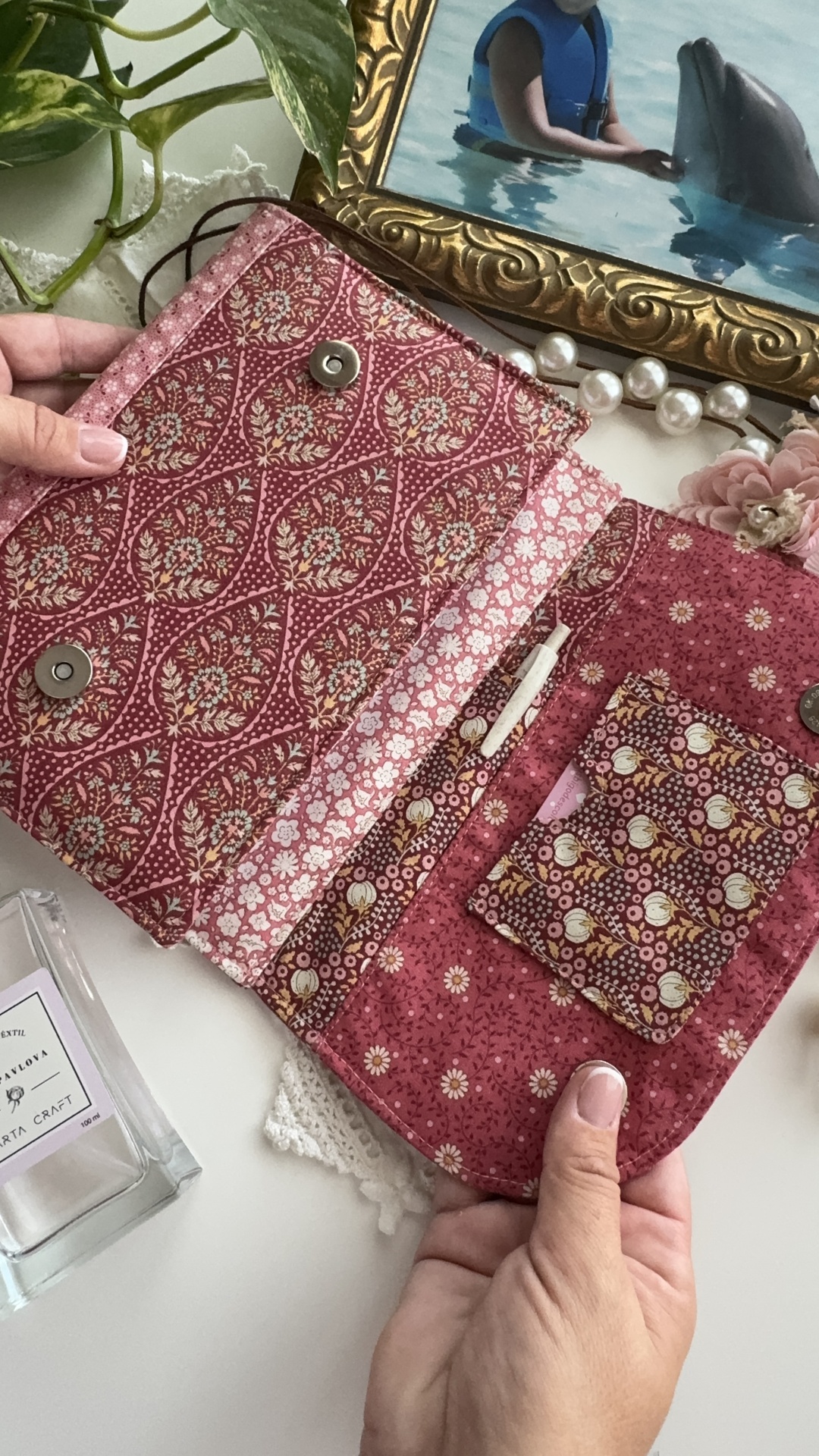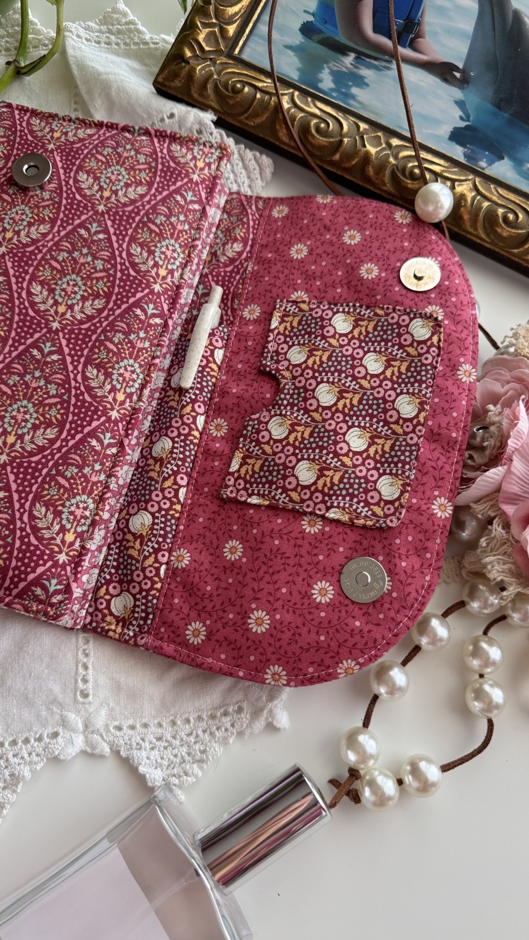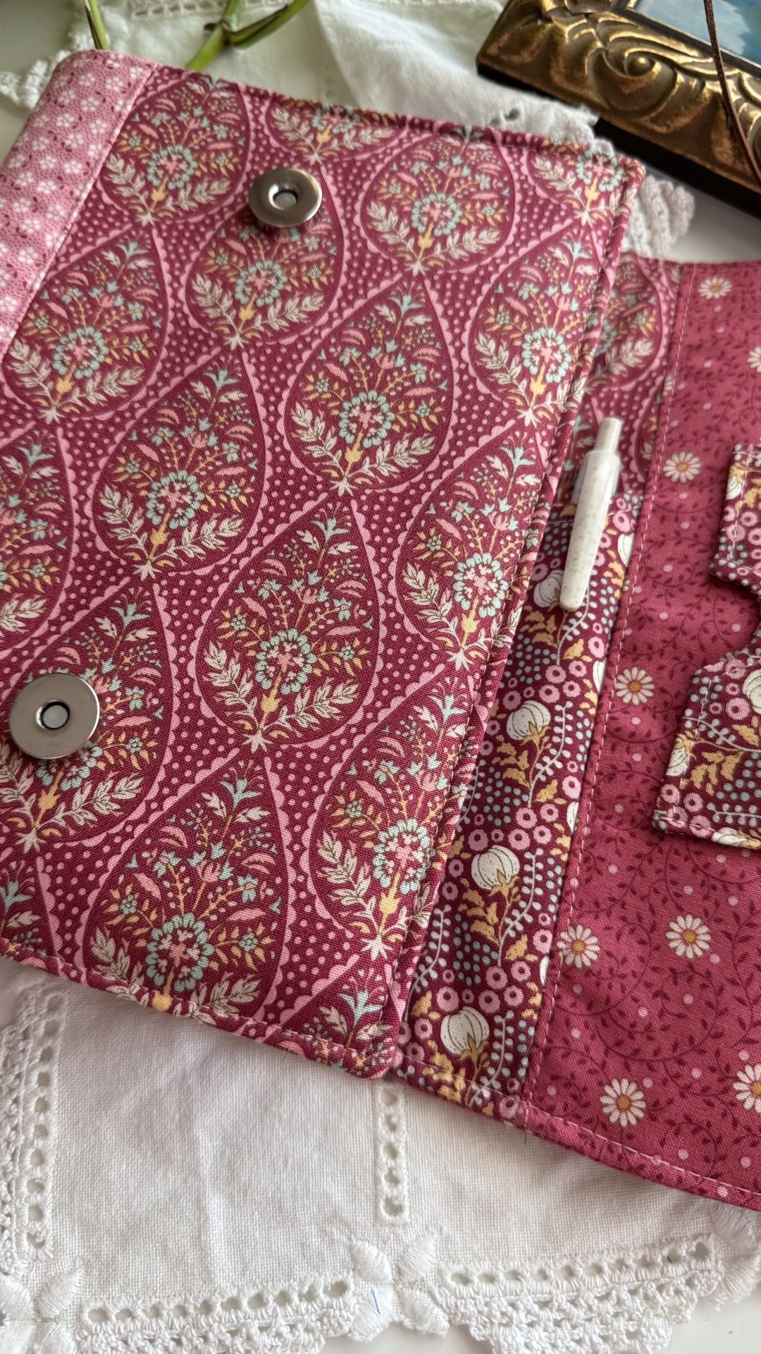 Capa de agenda A5 (com dimensão máxima de 21x15 e com lombada máxima de 2,5cm) com imensos bolsos interiores para cartões, folhas de apontamentos e recados; bolso para canetas e espaço para folhas soltas. Mola magnética para facilitar o fecho da agenda.
