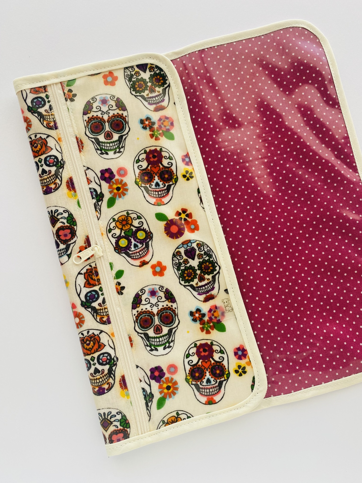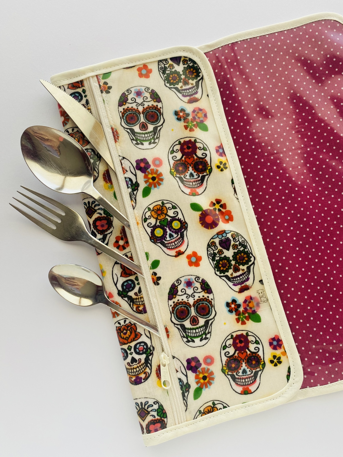 Os talheres são guardados num bolso próprio, também ele todo plastificado com espaço suficiente para os 4 talheres e guardanapo. O bolso dos talheres fecho com zipper para que esteja garantido que os mesmos não caiam durante o manuseamento da peça.