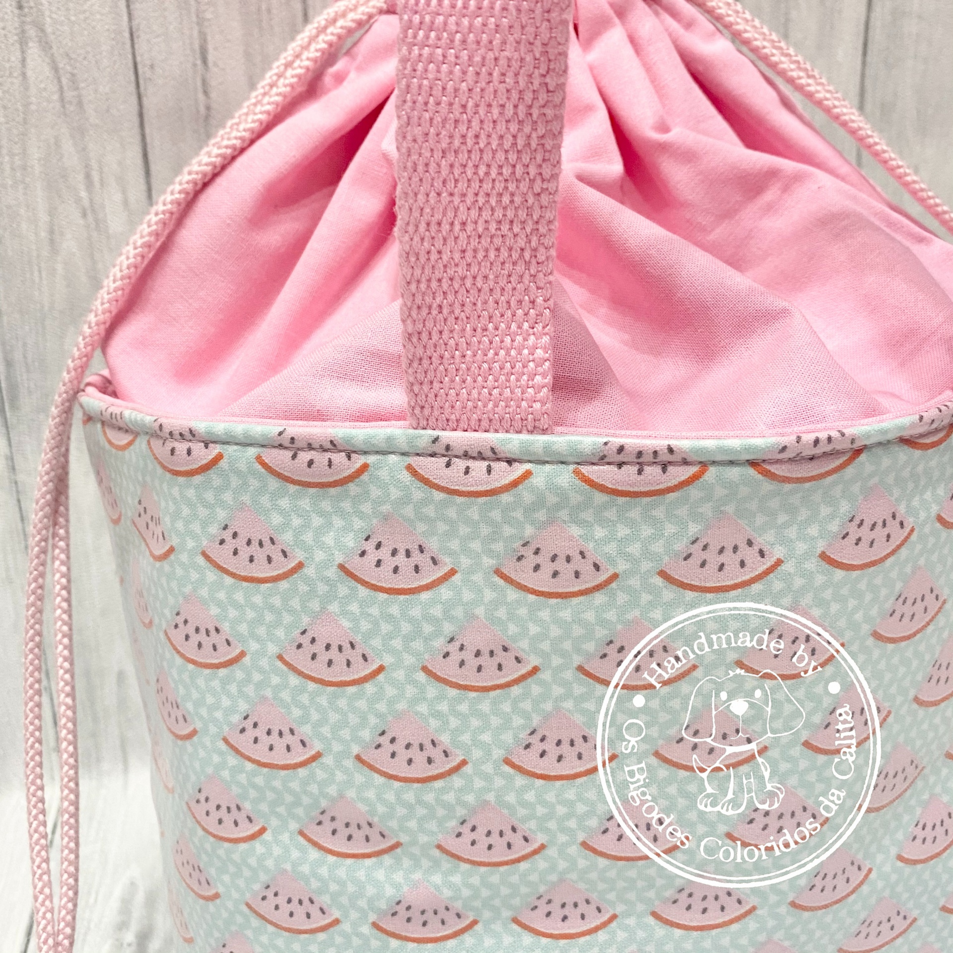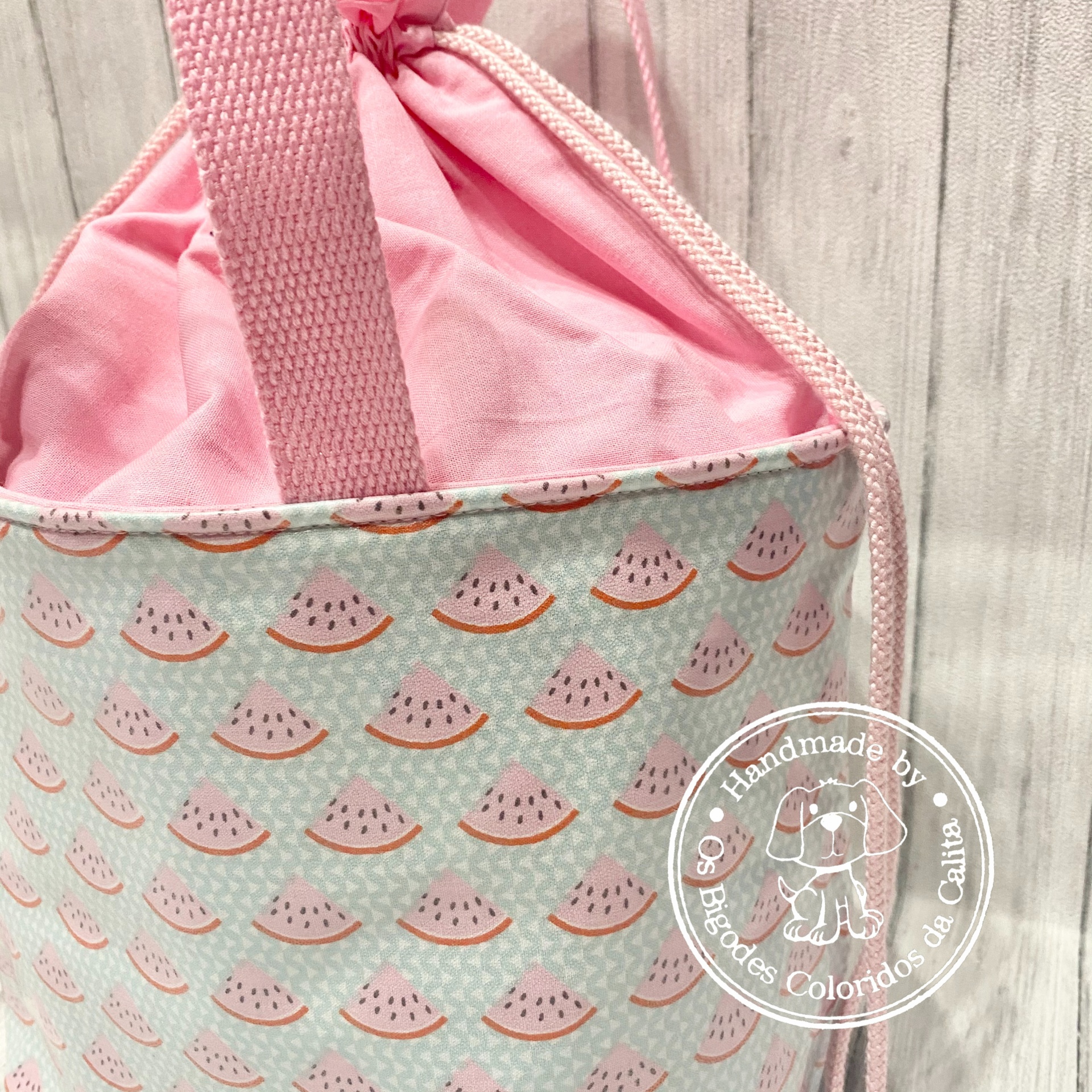 Elaborada com tecido plastificado e térmico maleável (para que os alimentos se conservem durante mais tempo). Alças de percinta de algodão e parte de cima de tecido de algodão, ajustavél por cordão de algodão.