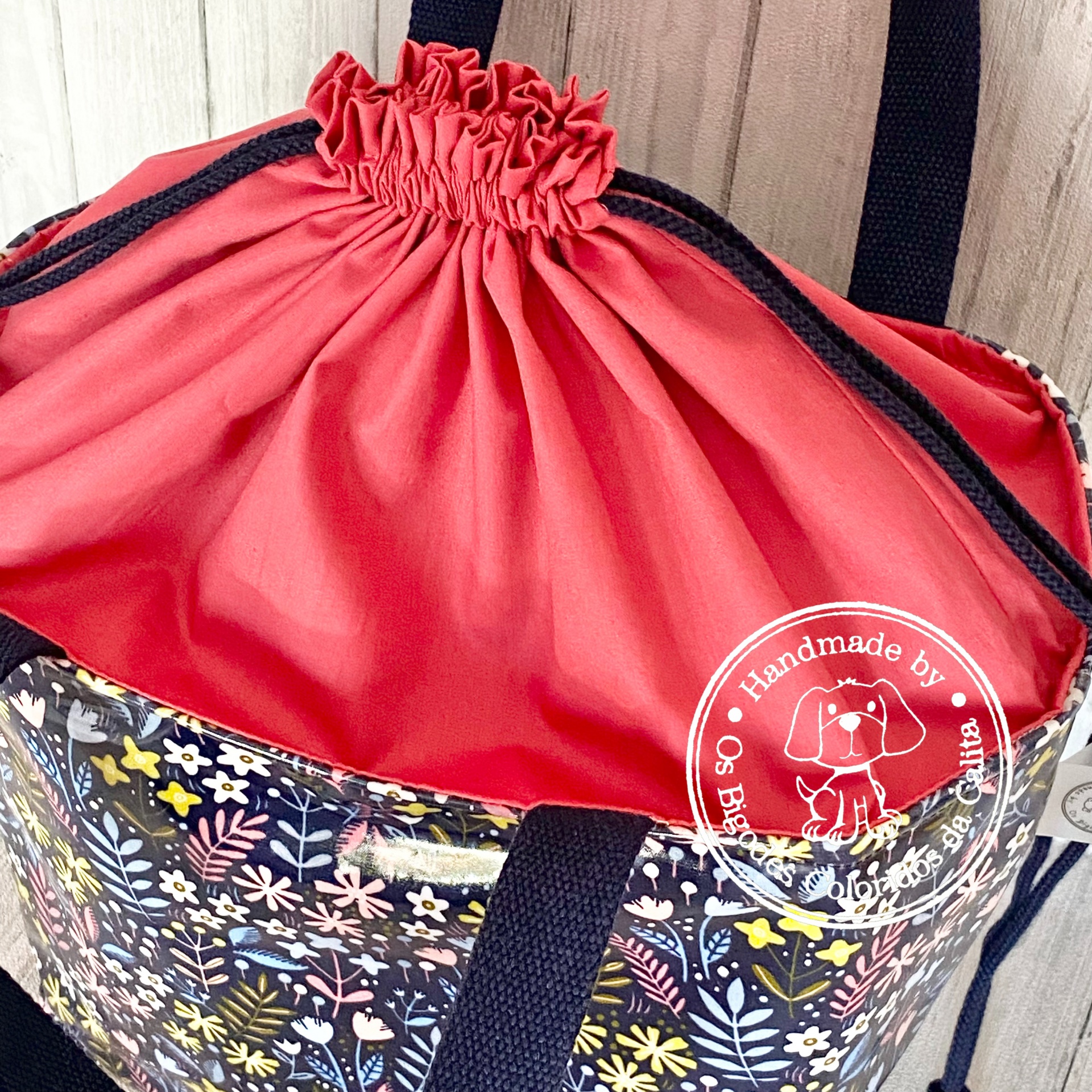 Elaborada com tecido plastificado e térmico maleável (para que os alimentos se conservem durante mais tempo). Alças de percinta de algodão e parte de cima de tecido de algodão, ajustavél por cordão de algodão.