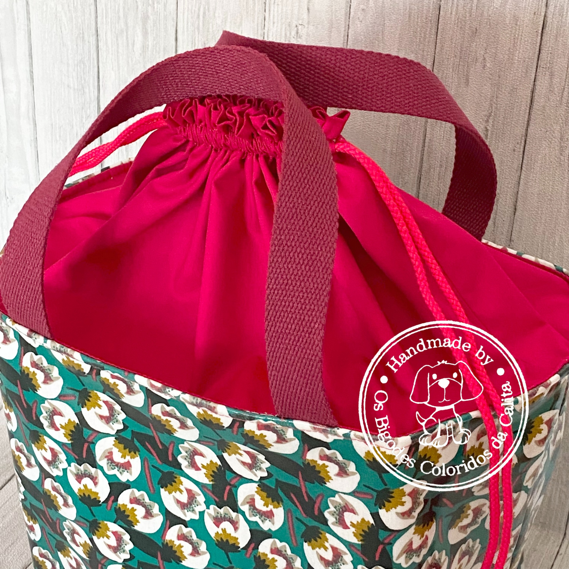 Elaborada com tecido plastificado e térmico maleável (para que os alimentos se conservem durante mais tempo). Alças de percinta de algodão e parte de cima de tecido de algodão, ajustavél por cordão de algodão.