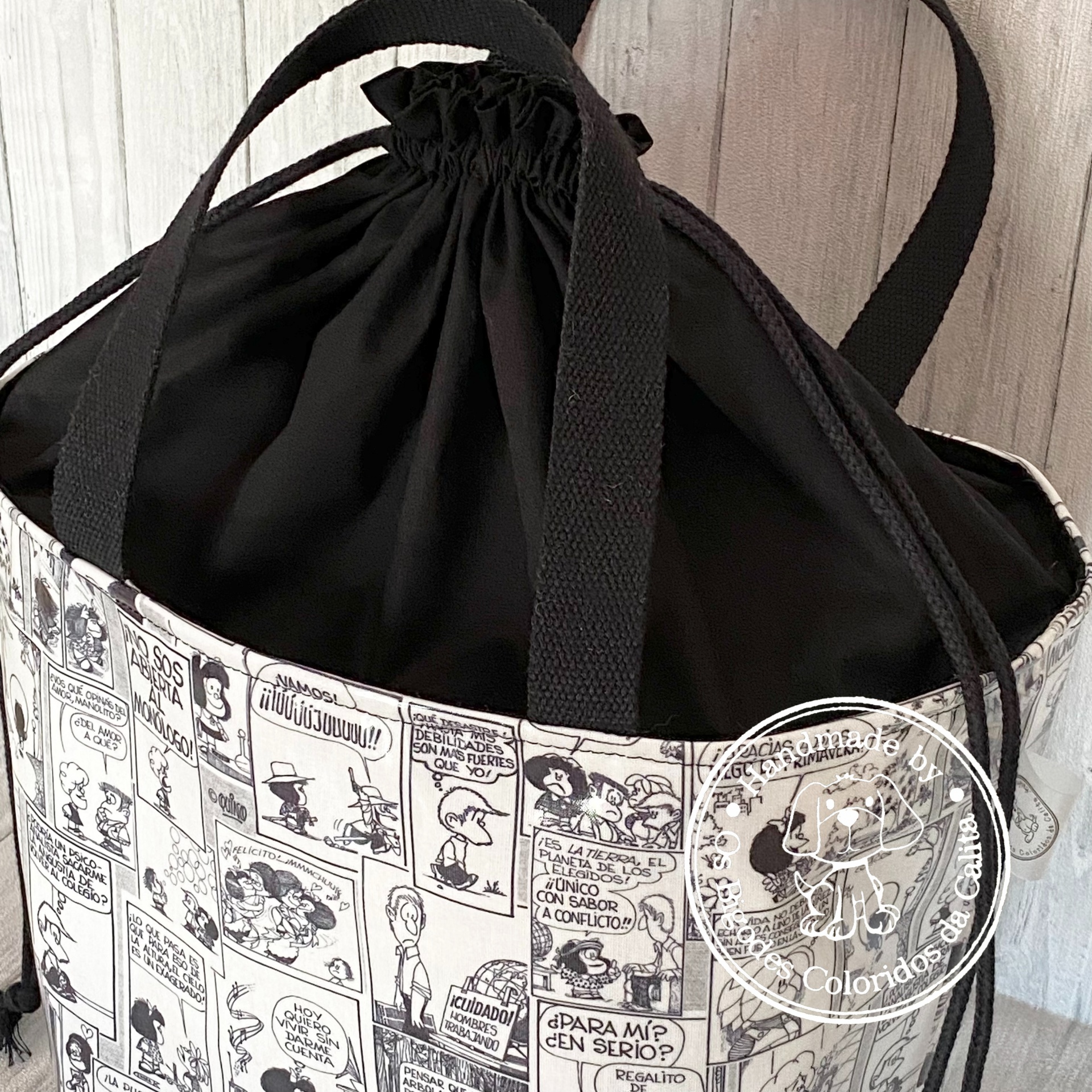 Elaborada com tecido plastificado e térmico maleável (para que os alimentos se conservem durante mais tempo). Alças de percinta de algodão e parte de cima de tecido de algodão, ajustavél por cordão de algodão.
