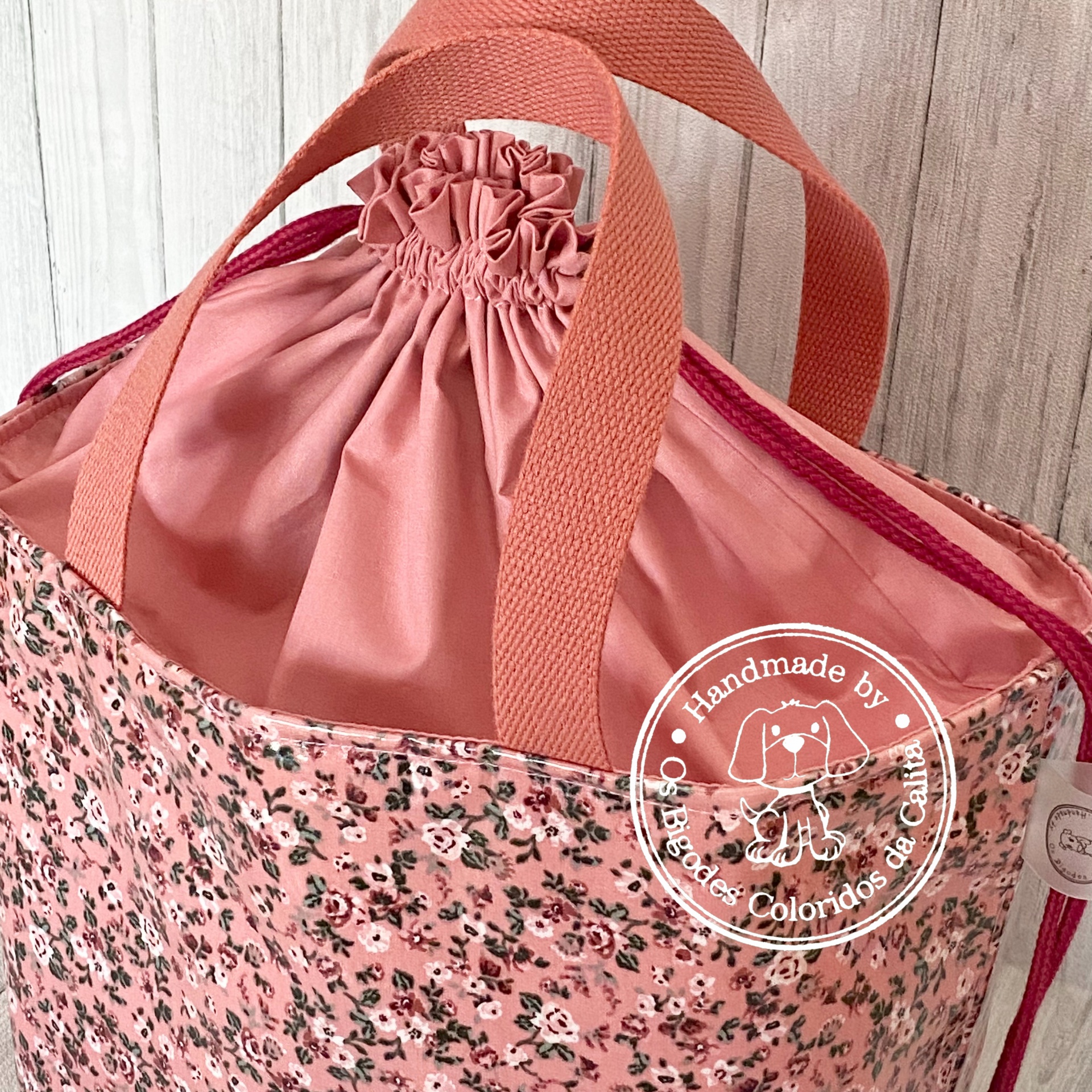 Elaborada com tecido plastificado e térmico maleável (para que os alimentos se conservem durante mais tempo). Alças de percinta de algodão e parte de cima de tecido de algodão, ajustavél por cordão de algodão.