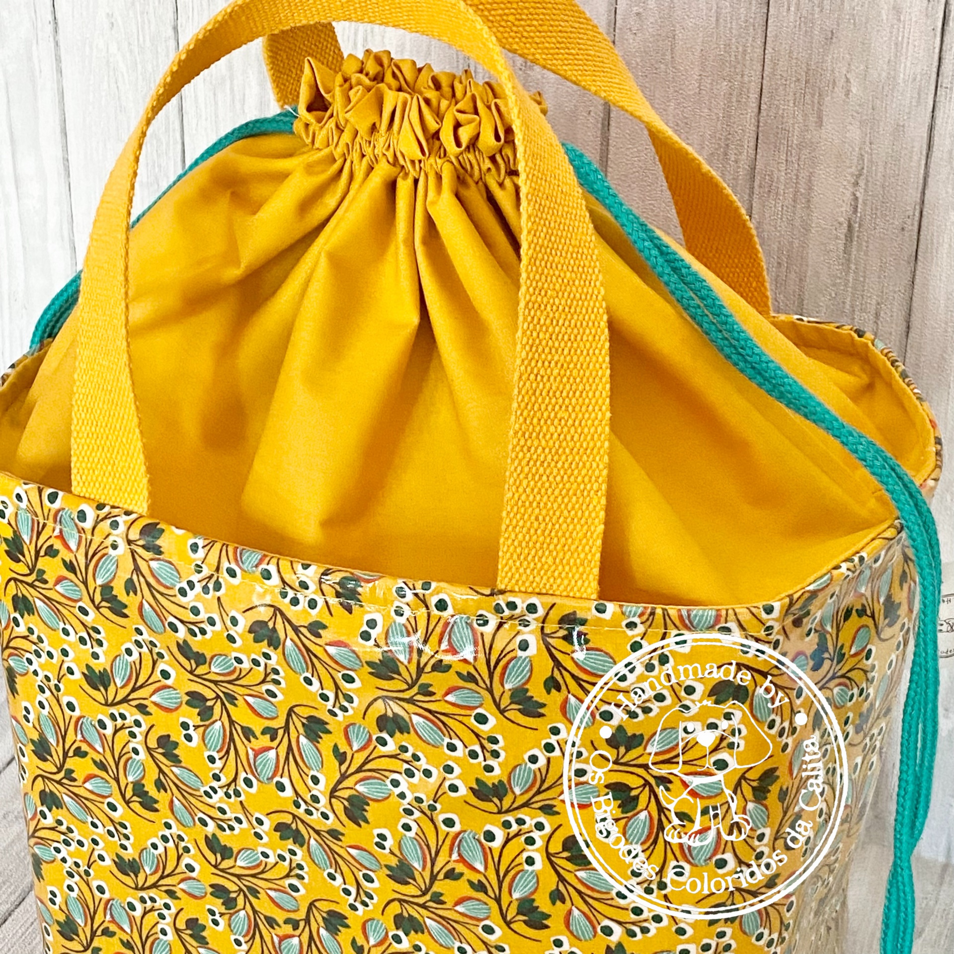 Elaborada com tecido plastificado e térmico maleável (para que os alimentos se conservem durante mais tempo). Alças de percinta de algodão e parte de cima de tecido de algodão, ajustavél por cordão de algodão.