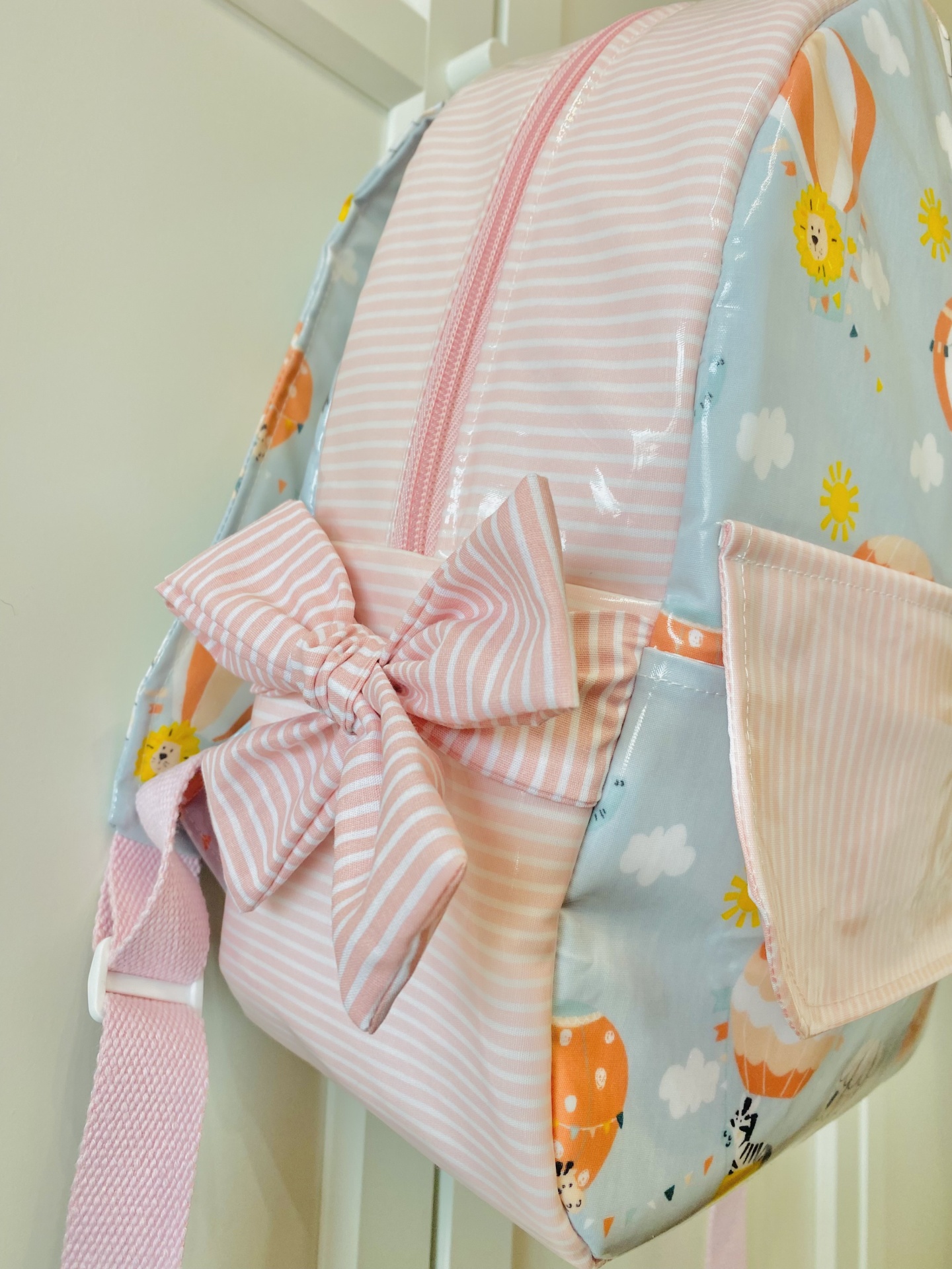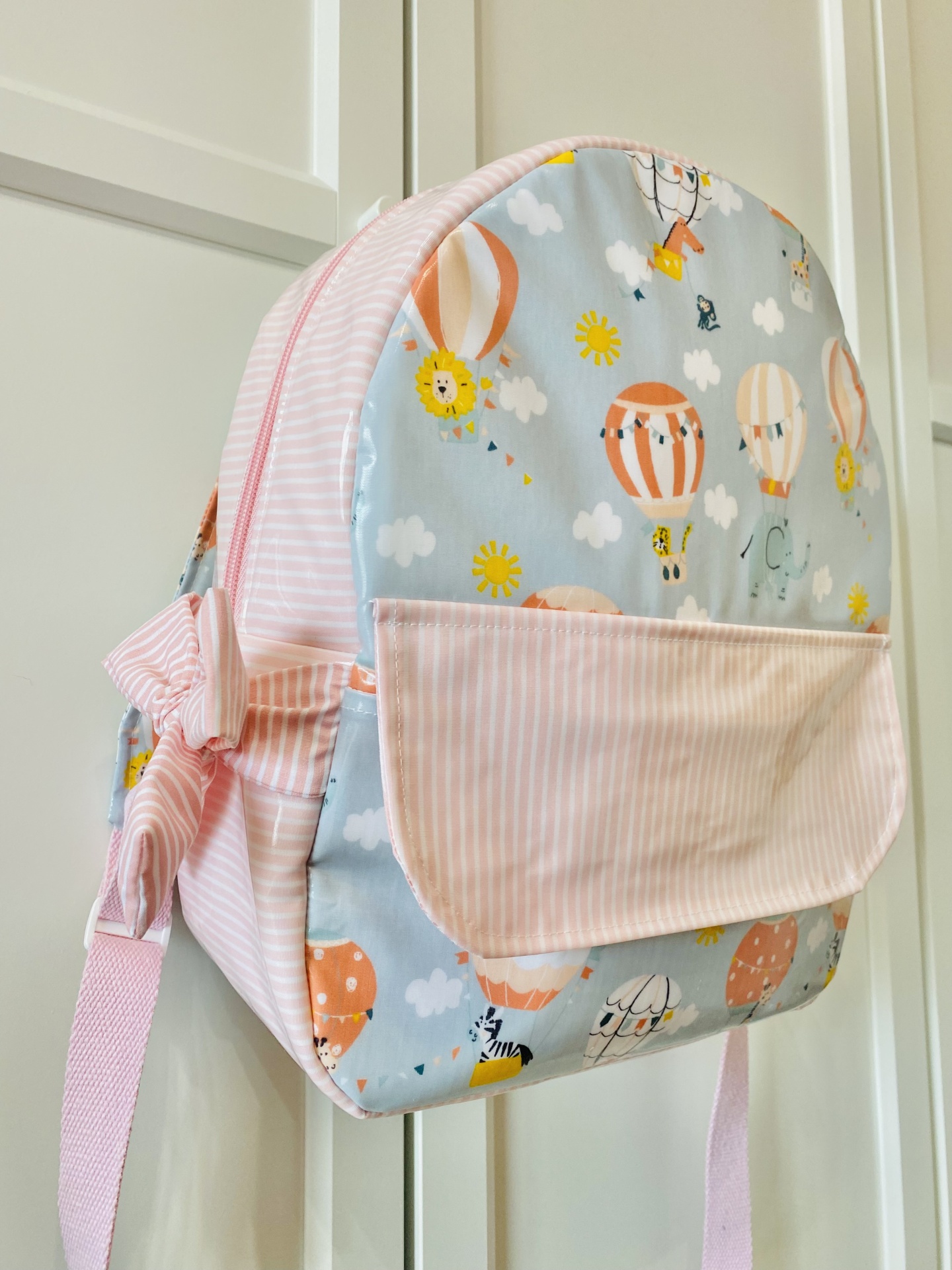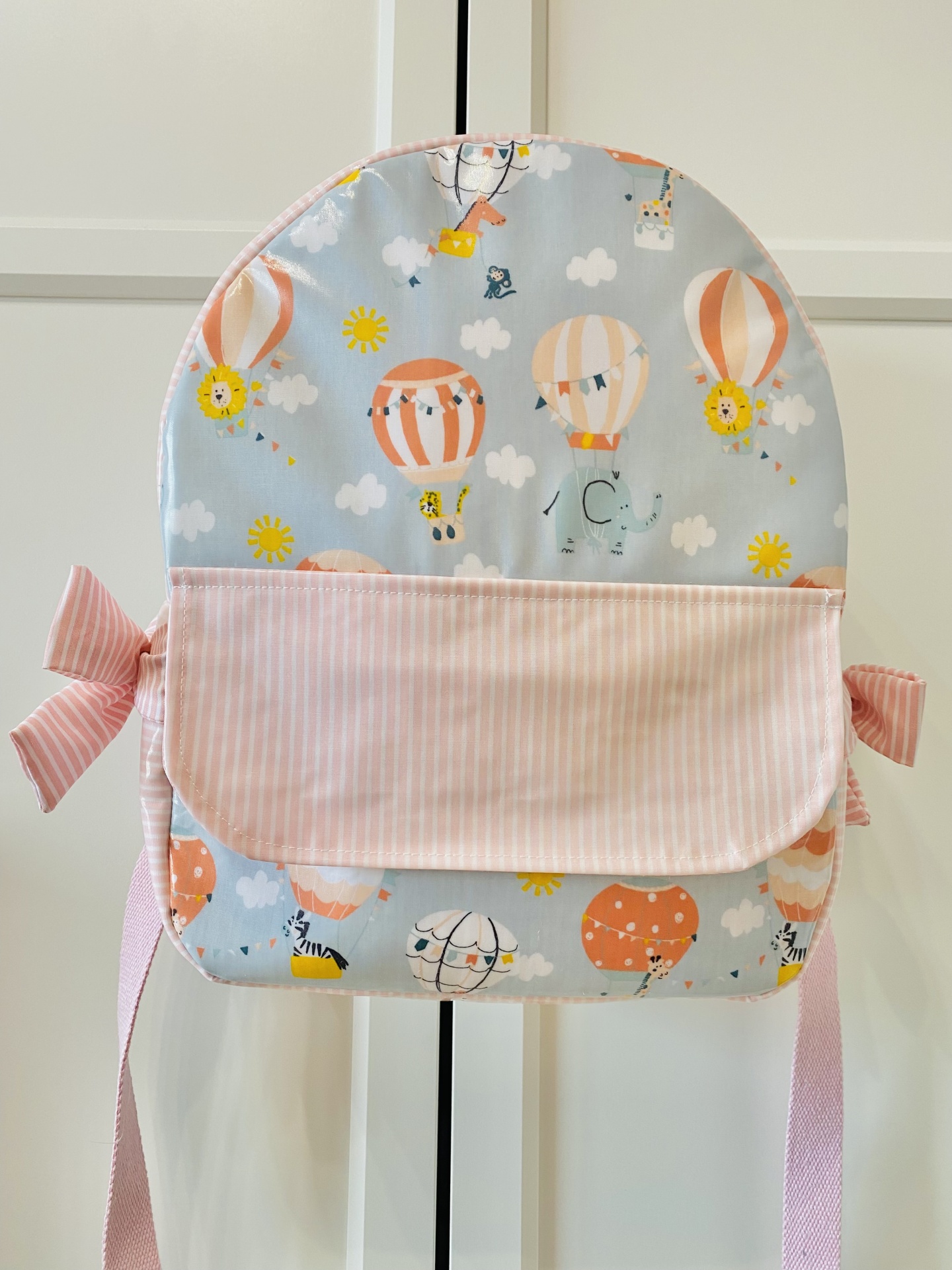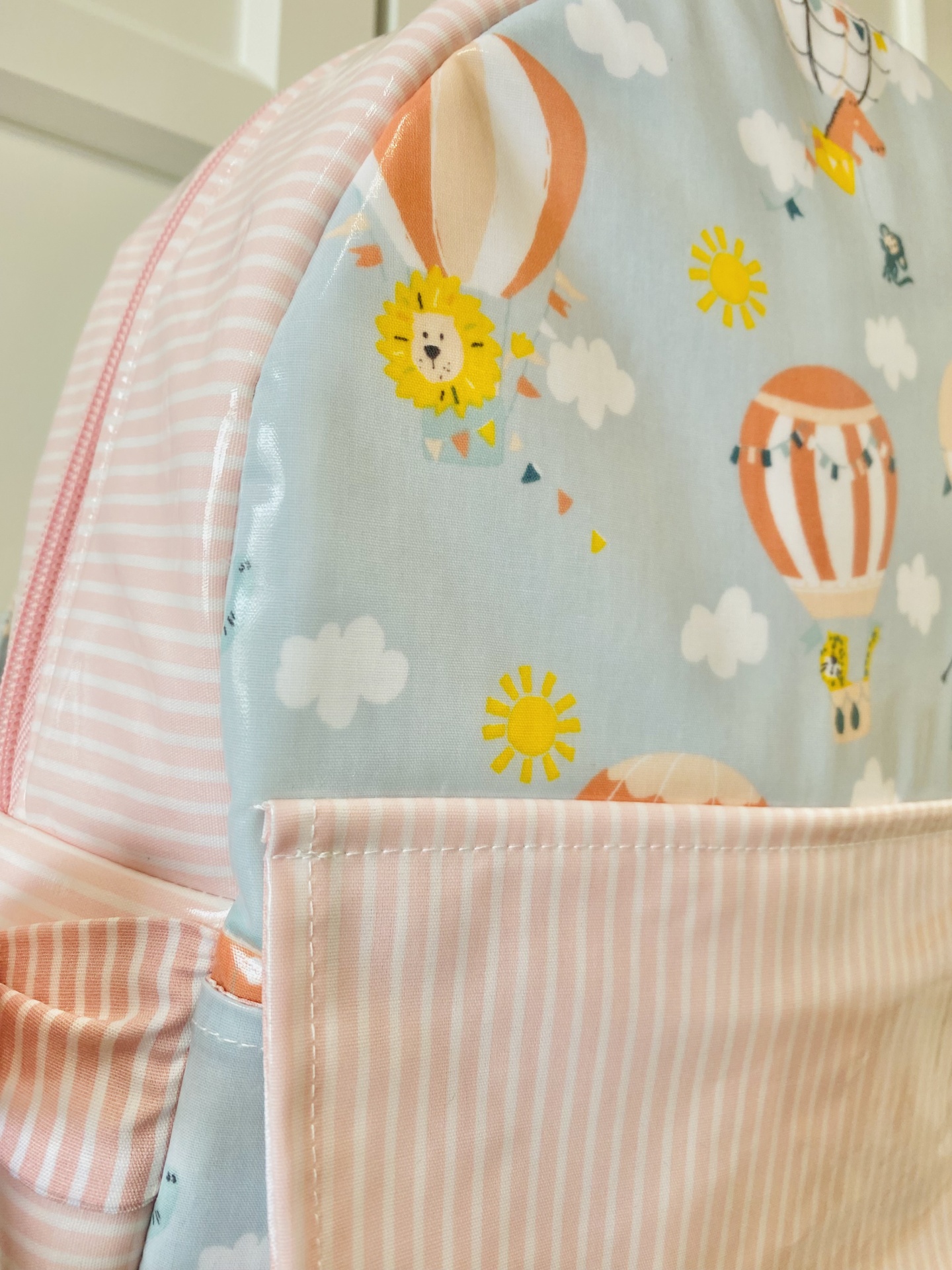 Mochila de tecido plastificado no exterior e tecido de algodão no interior.