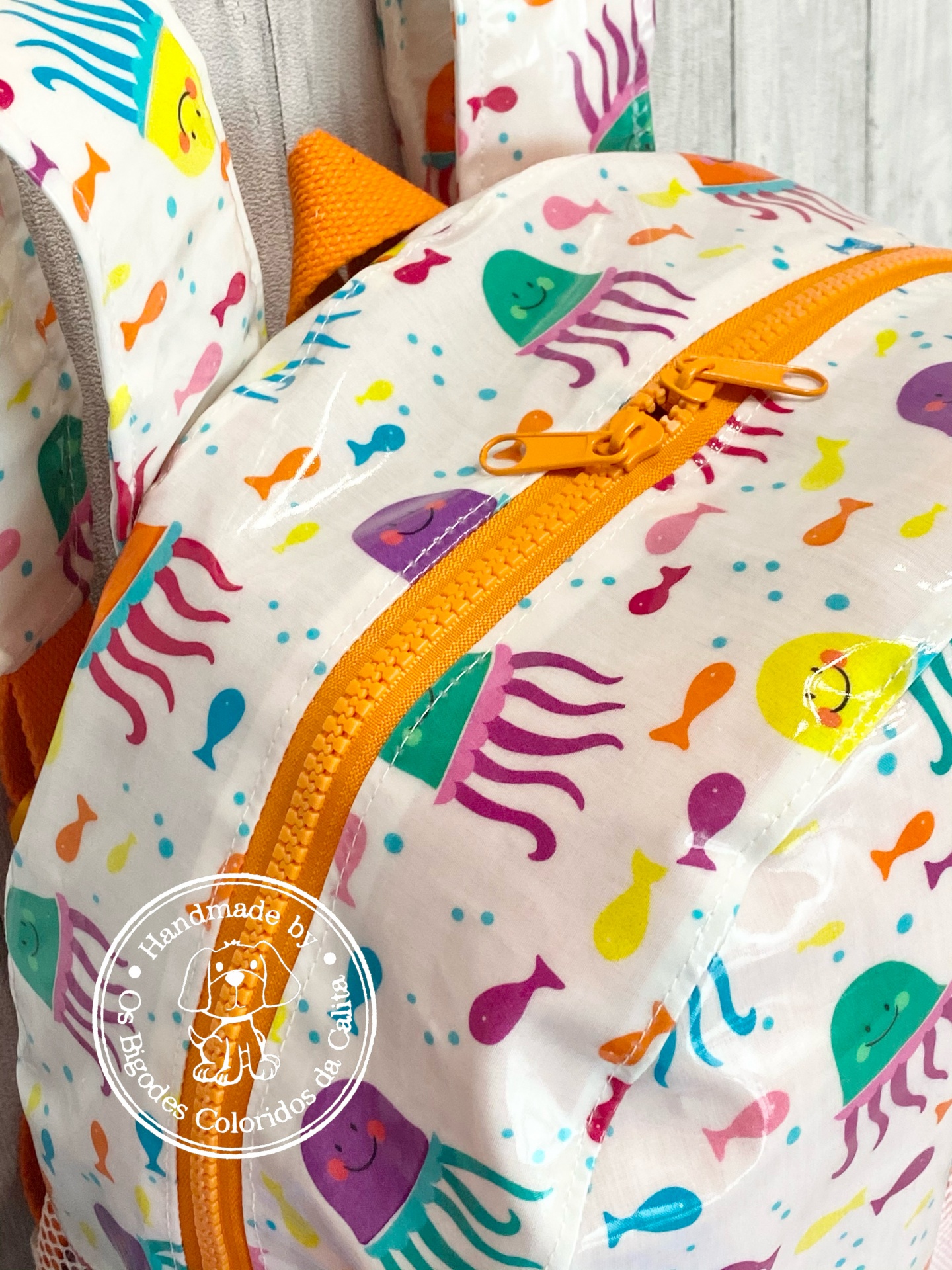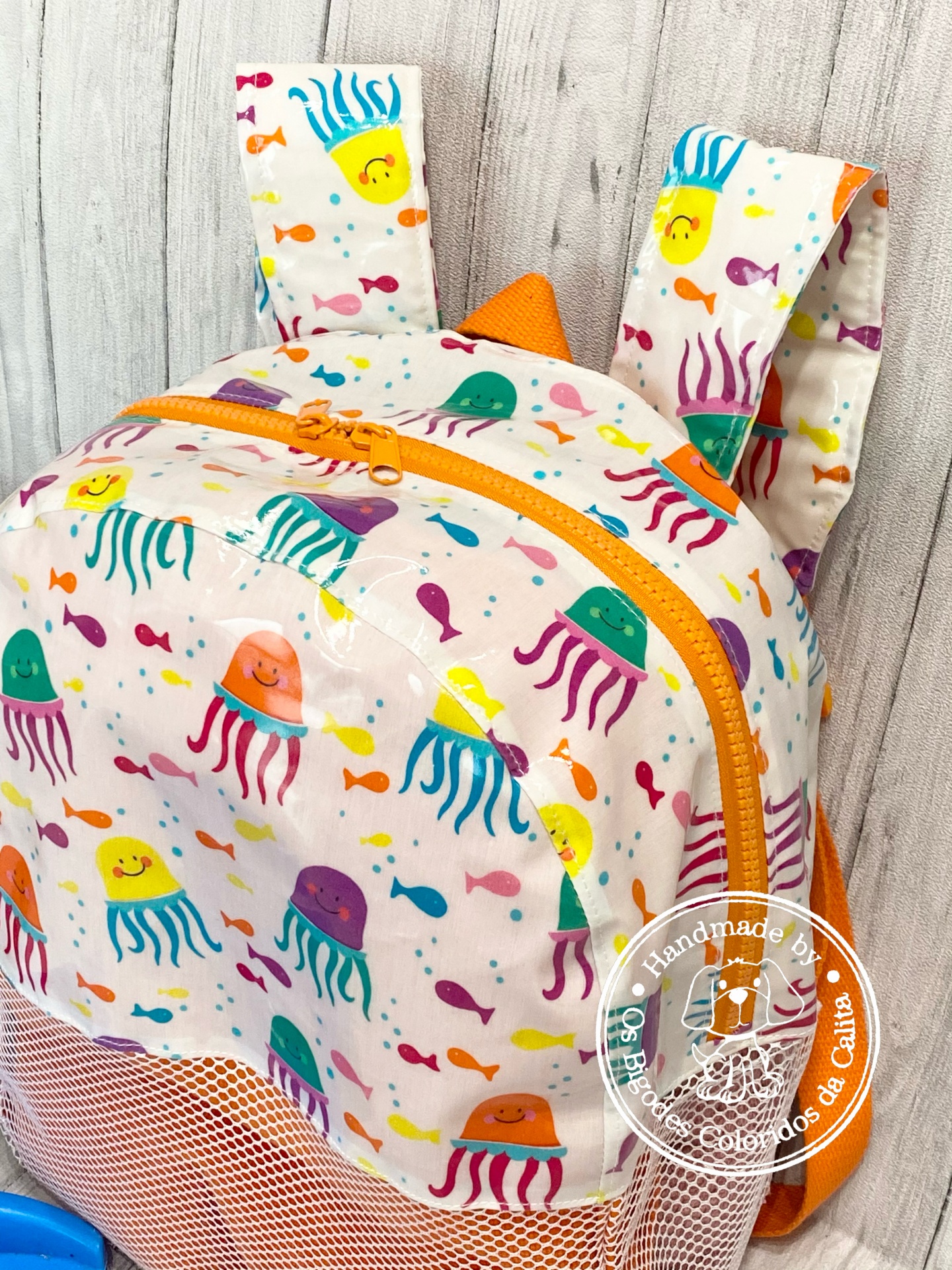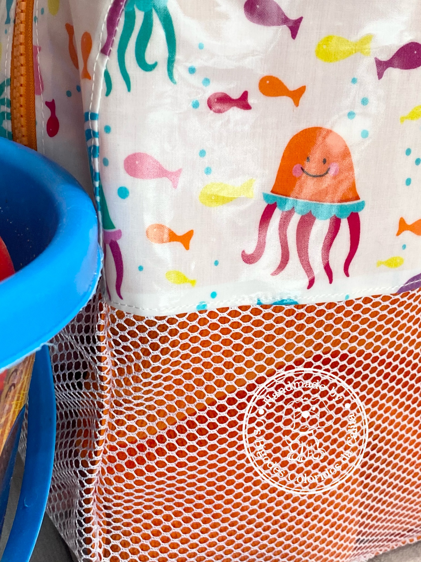 Mochila de praia feita em tecido plastificado e rede mesh. O tecido plastificado permite que a mochila possa apanhar humidade e a rede mesh facilita a limpeza dos brinquedos, permitindo assim que a areia caia quando sacudida, evitando assim "levar" a tão indesejada areia.