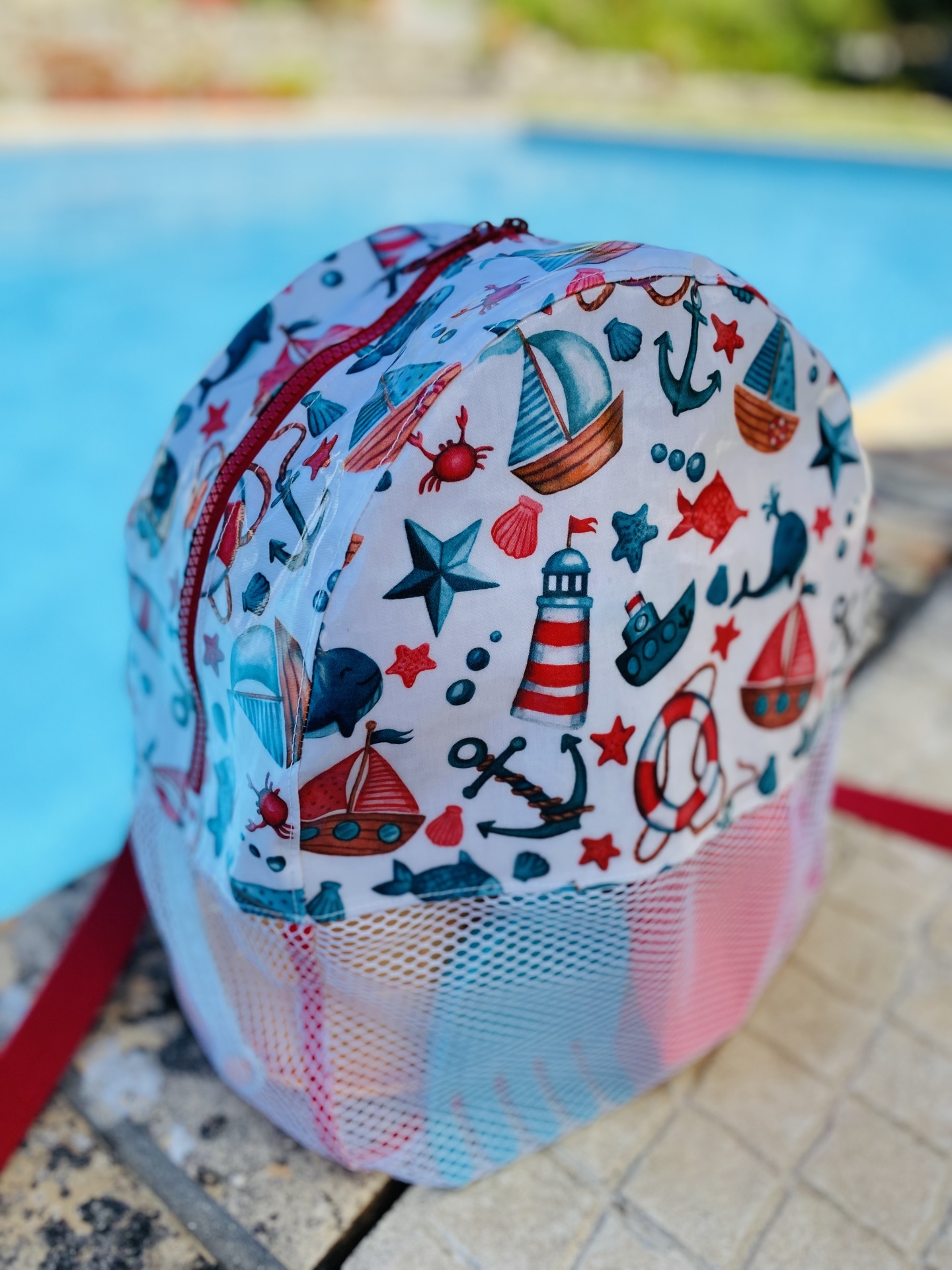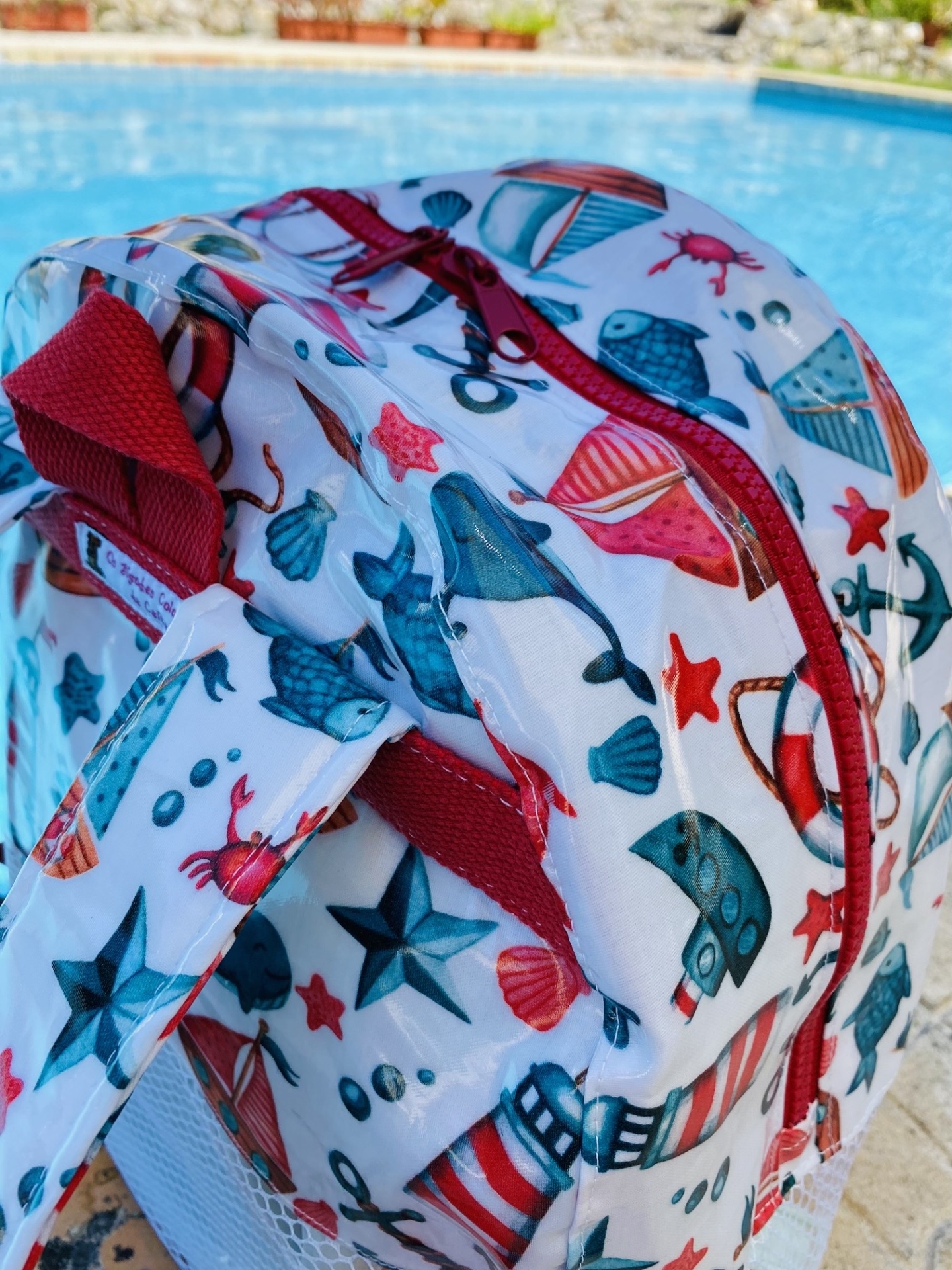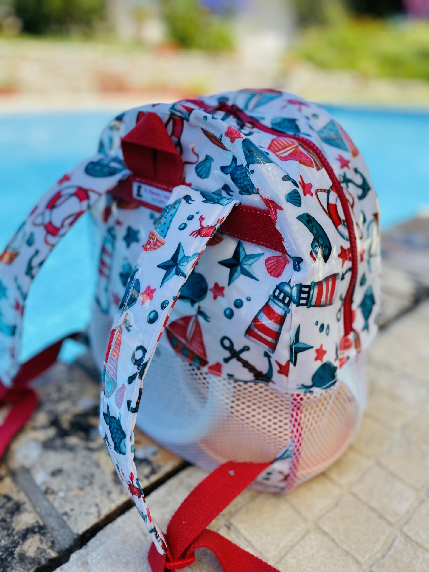 Mochila de praia feita em tecido plastificado e rede mesh. O tecido plastificado permite que a mochila possa apanhar humidade e a rede mesh facilita a limpeza dos brinquedos, permitindo assim que a areia caia quando sacudida, evitando assim "levar" a tão indesejada areia.