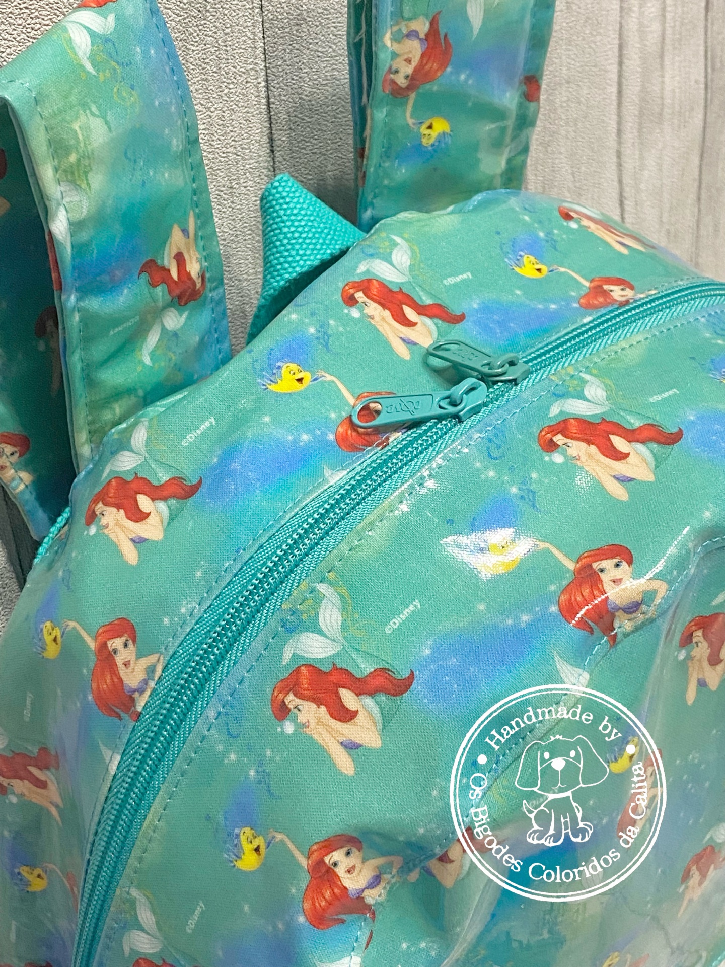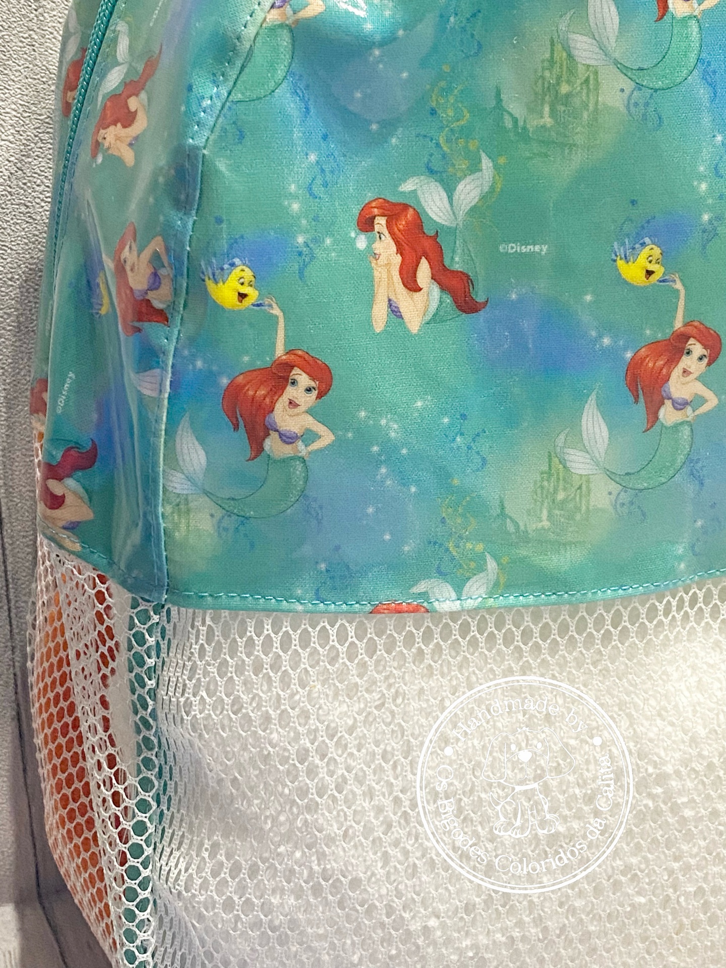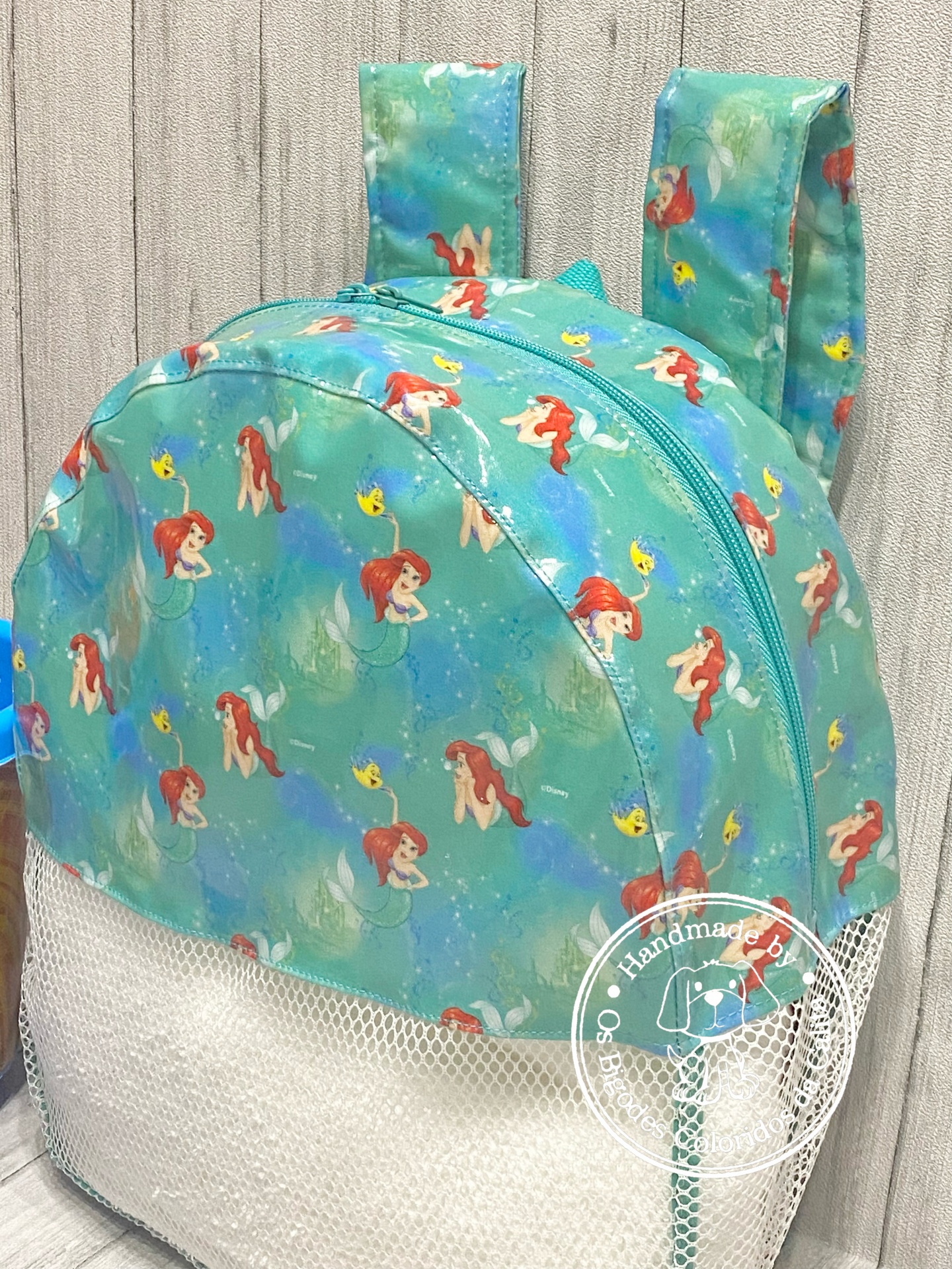Mochila de praia feita em tecido plastificado e rede mesh. O tecido plastificado permite que a mochila possa apanhar humidade e a rede mesh facilita a limpeza dos brinquedos, permitindo assim que a areia caia quando sacudida, evitando assim "levar" a tão indesejada areia.