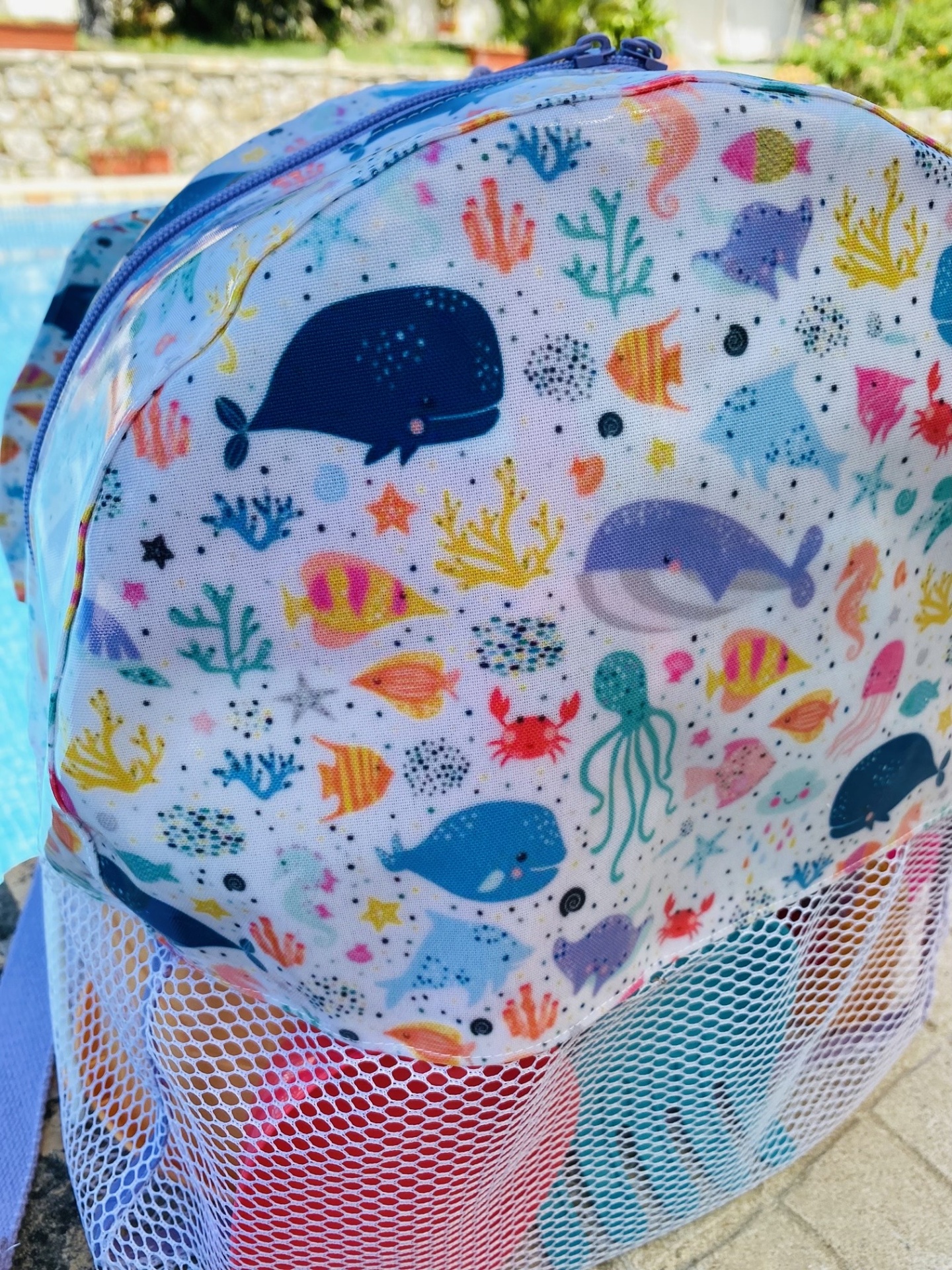 Mochila de praia feita em tecido plastificado e rede mesh. O tecido plastificado permite que a mochila possa apanhar humidade e a rede mesh facilita a limpeza dos brinquedos, permitindo assim que a areia caia quando sacudida, evitando assim "levar" a tão indesejada areia.
