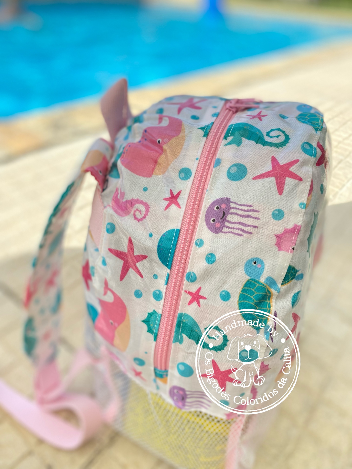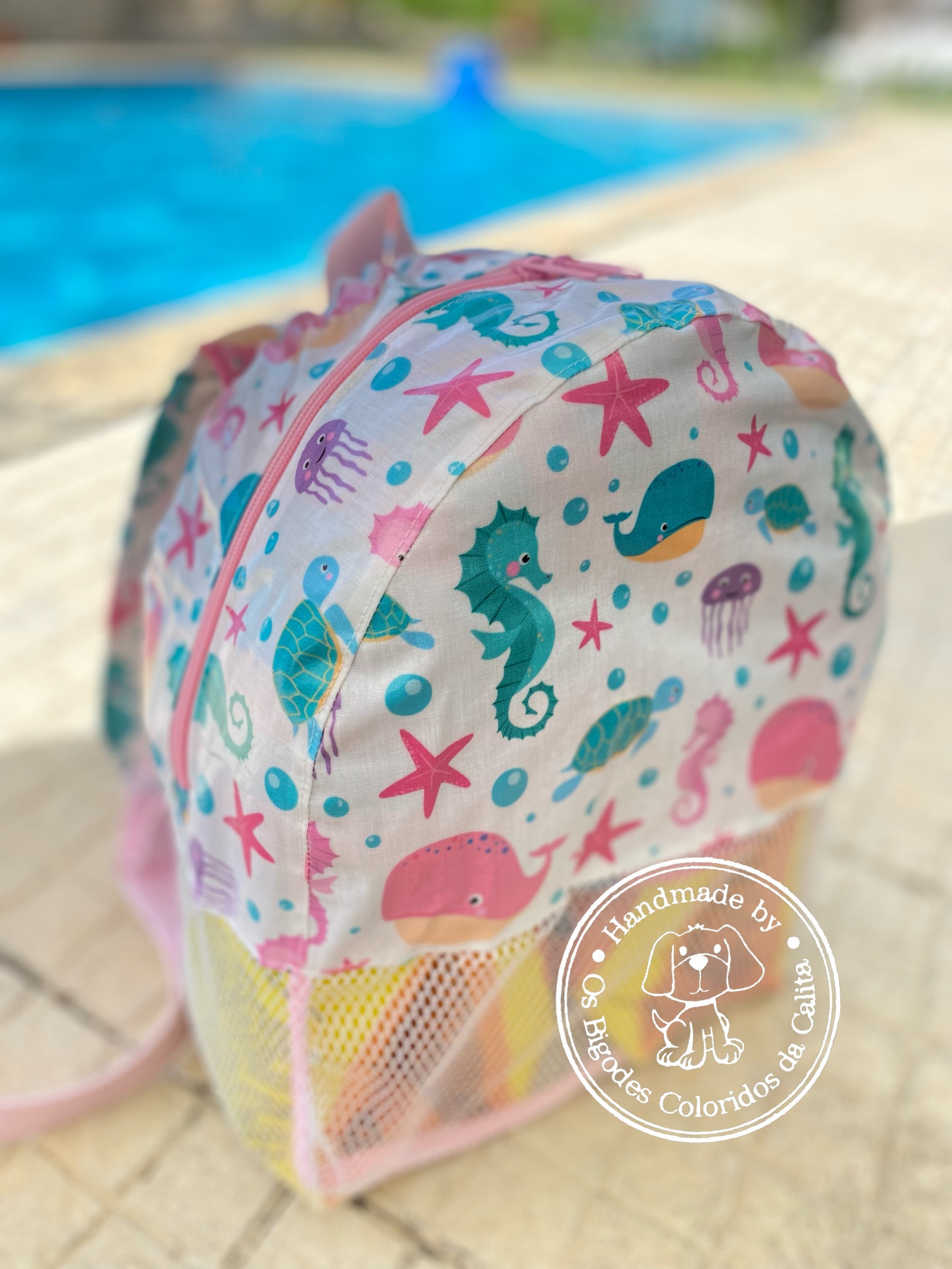 Mochila de praia feita em tecido plastificado e rede mesh. O tecido plastificado permite que a mochila possa apanhar humidade e a rede mesh facilita a limpeza dos brinquedos, permitindo assim que a areia caia quando sacudida, evitando assim "levar" a tão indesejada areia.
