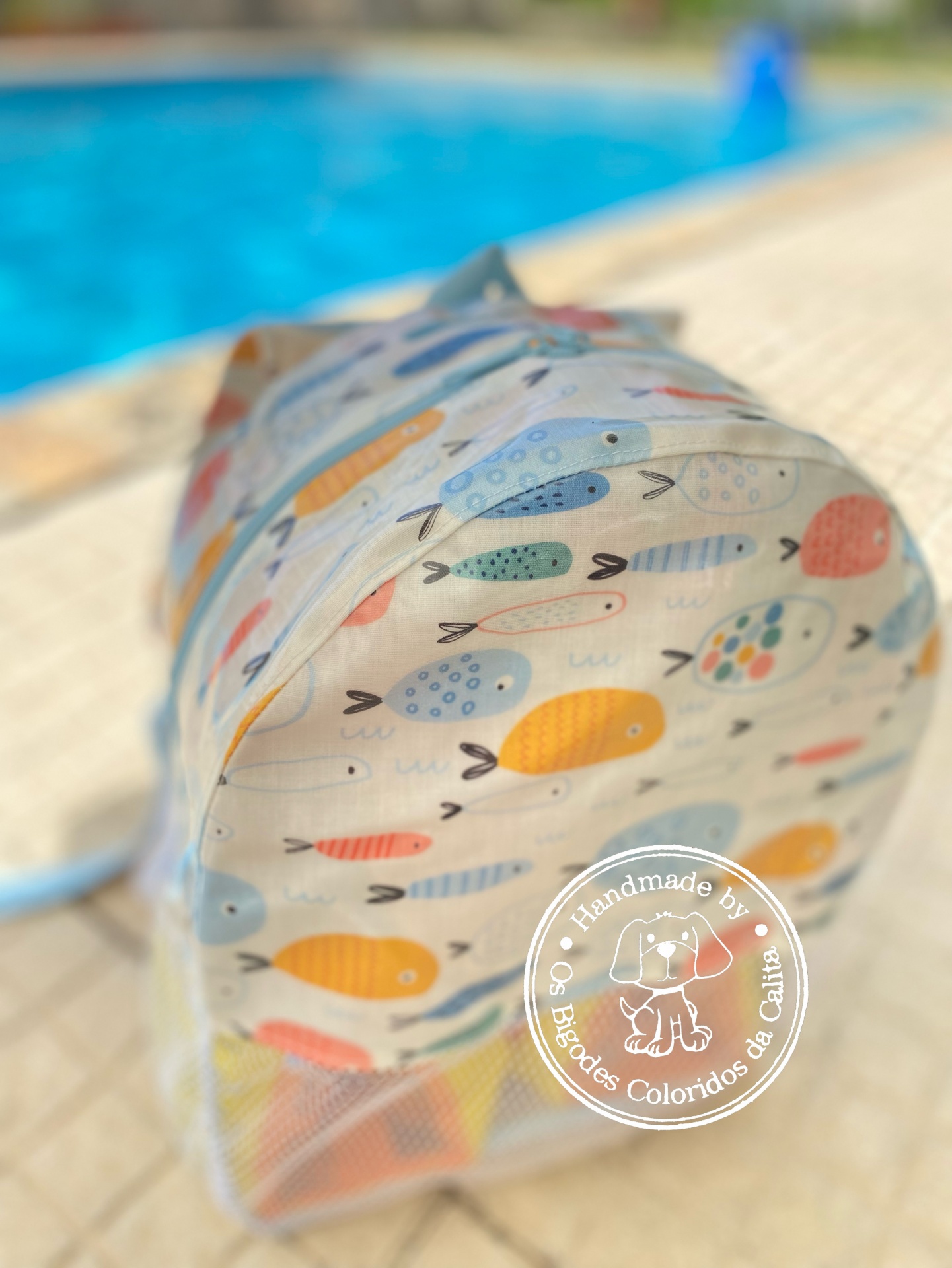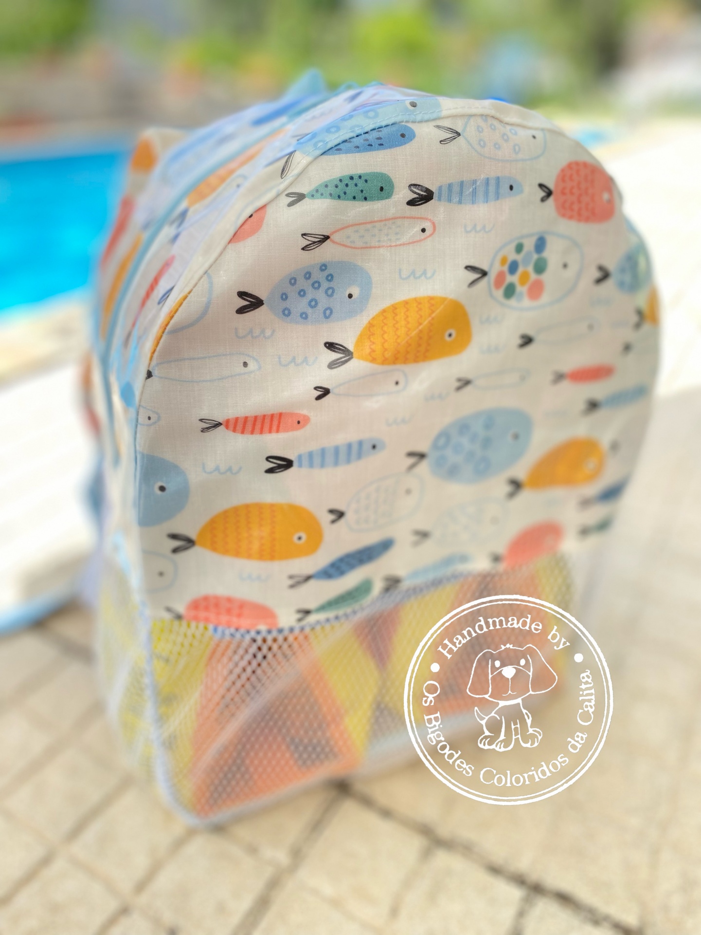 Já Mochila de praia feita em tecido plastificado e rede mesh. O tecido plastificado permite que a mochila possam seja resistente à humidade e a rede mesh facilita a limpeza dos brinquedos, permitindo assim que a areia caia quando sacudida, evitando assim "levar" a tão indesejada areia.
