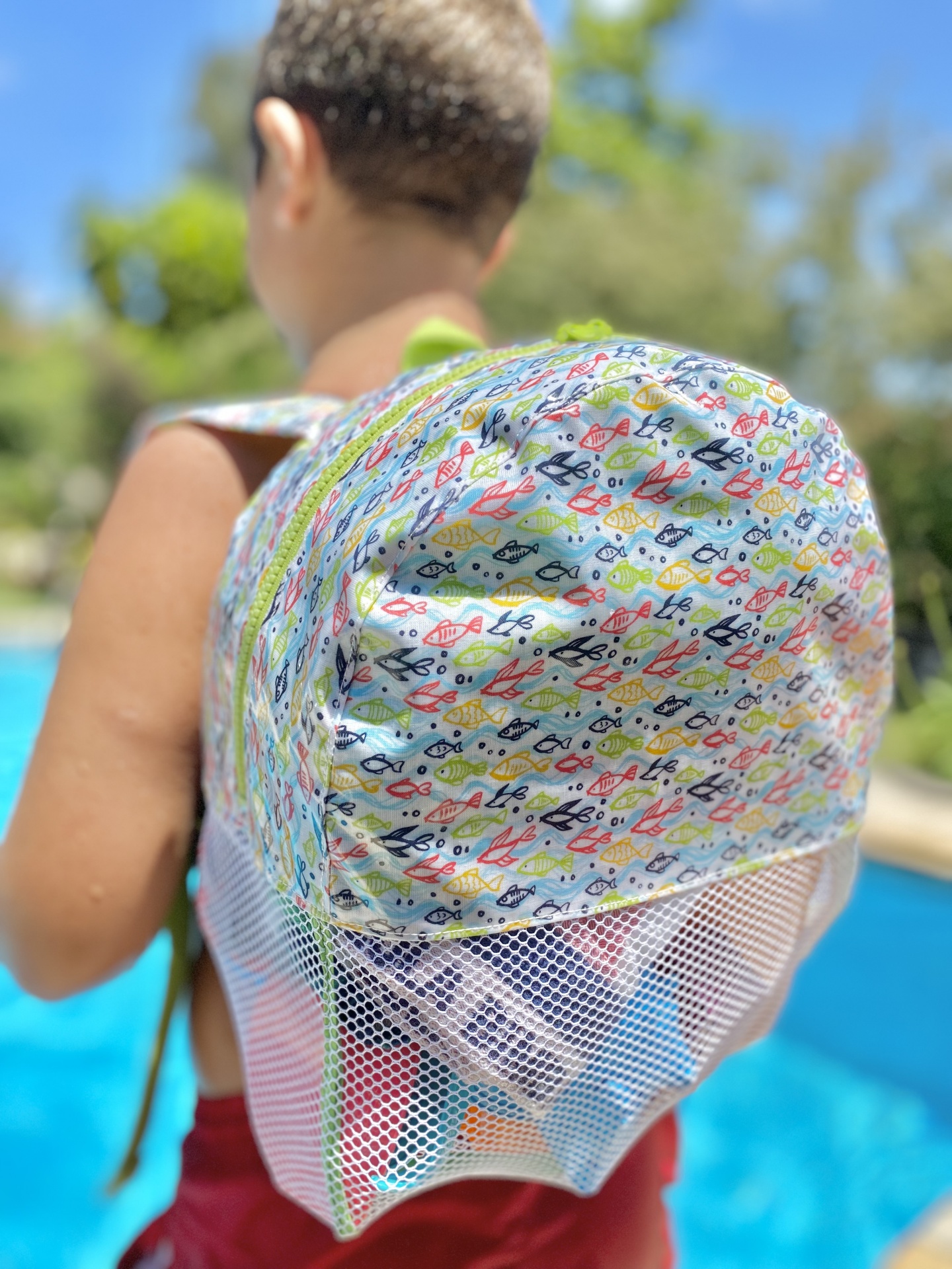 Mochila de praia feita em tecido plastificado e rede mesh. O tecido plastificado permite que a mochila possa apanhar humidade e a rede mesh facilita a limpeza dos brinquedos, permitindo assim que a areia caia quando sacudida, evitando assim "levar" a tão indesejada areia.