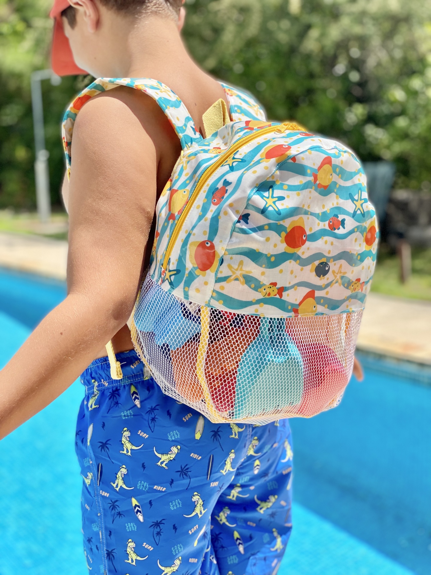 Mochila de praia feita em tecido plastificado e rede mesh. O tecido plastificado permite que a mochila possa apanhar humidade e a rede mesh facilita a limpeza dos brinquedos, permitindo assim que a areia caia quando sacudida, evitando assim "levar" a tão indesejada areia.