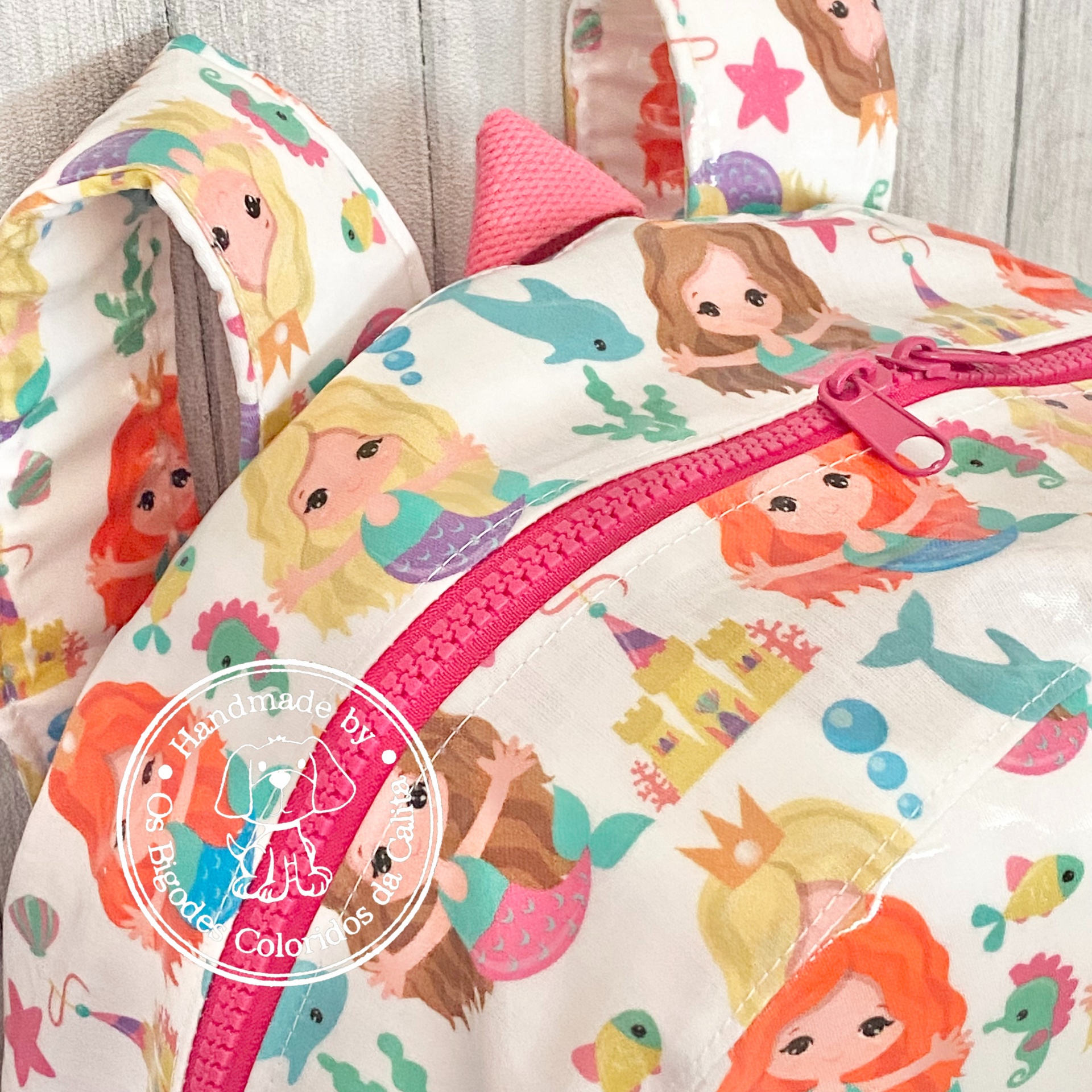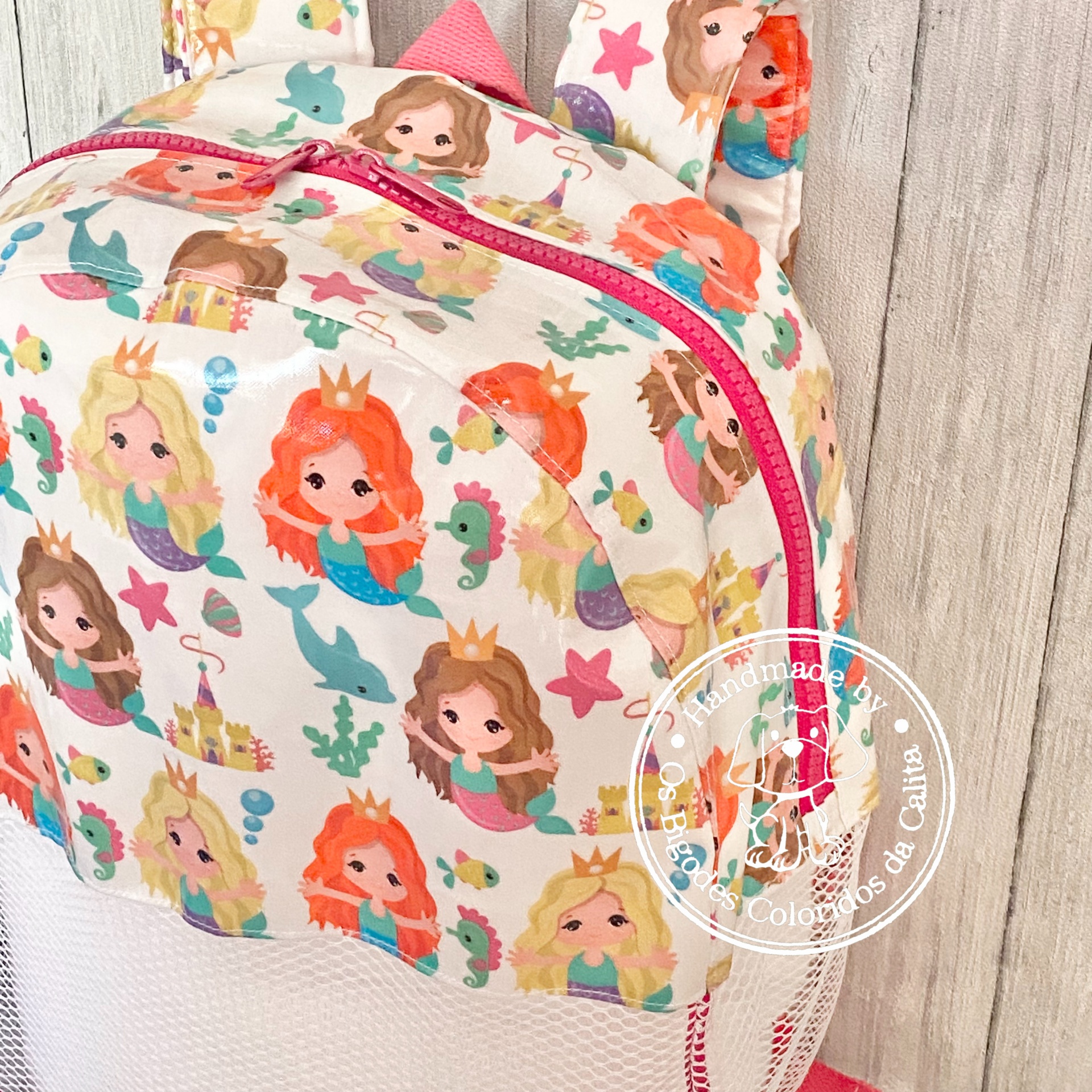 Mochila de praia feita em tecido plastificado e rede mesh. O tecido plastificado permite que a mochila possa apanhar humidade e a rede mesh facilita a limpeza dos brinquedos, permitindo assim que a areia caia quando sacudida, evitando assim "levar" a tão indesejada areia.