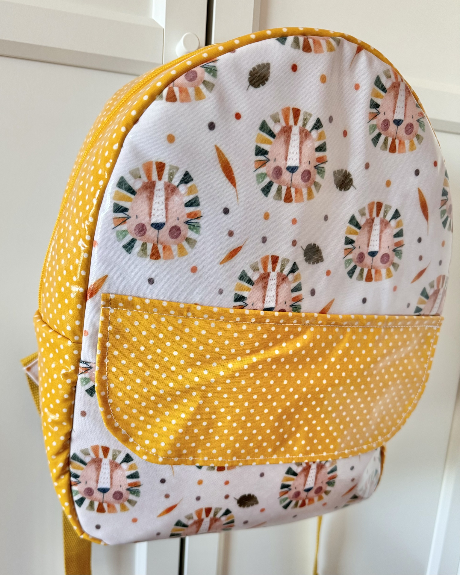 Mochila de tecido plastificado no exterior e tecido de algodão no interior.