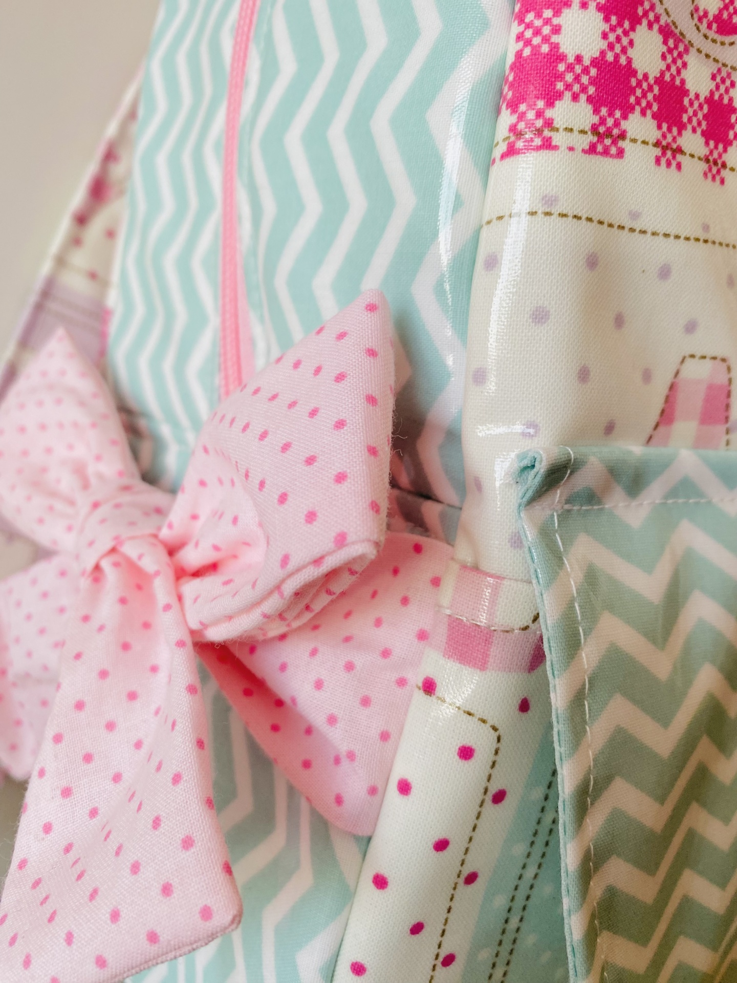 Mochila de tecido plastificado no exterior e tecido de algodão no interior.