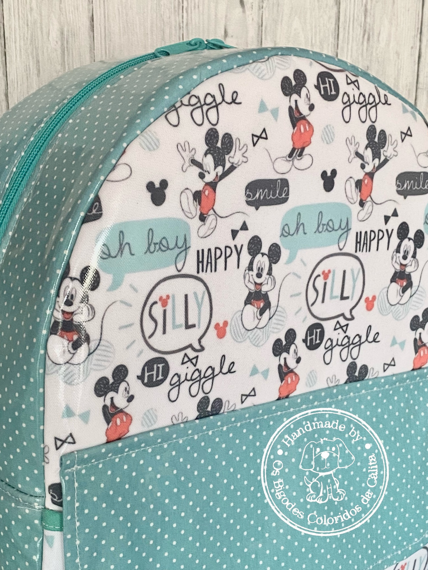Mochila de tecido plastificado no exterior e tecido de algodão no interior.
