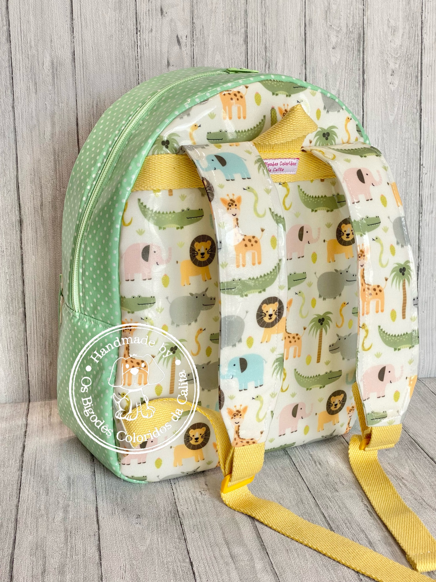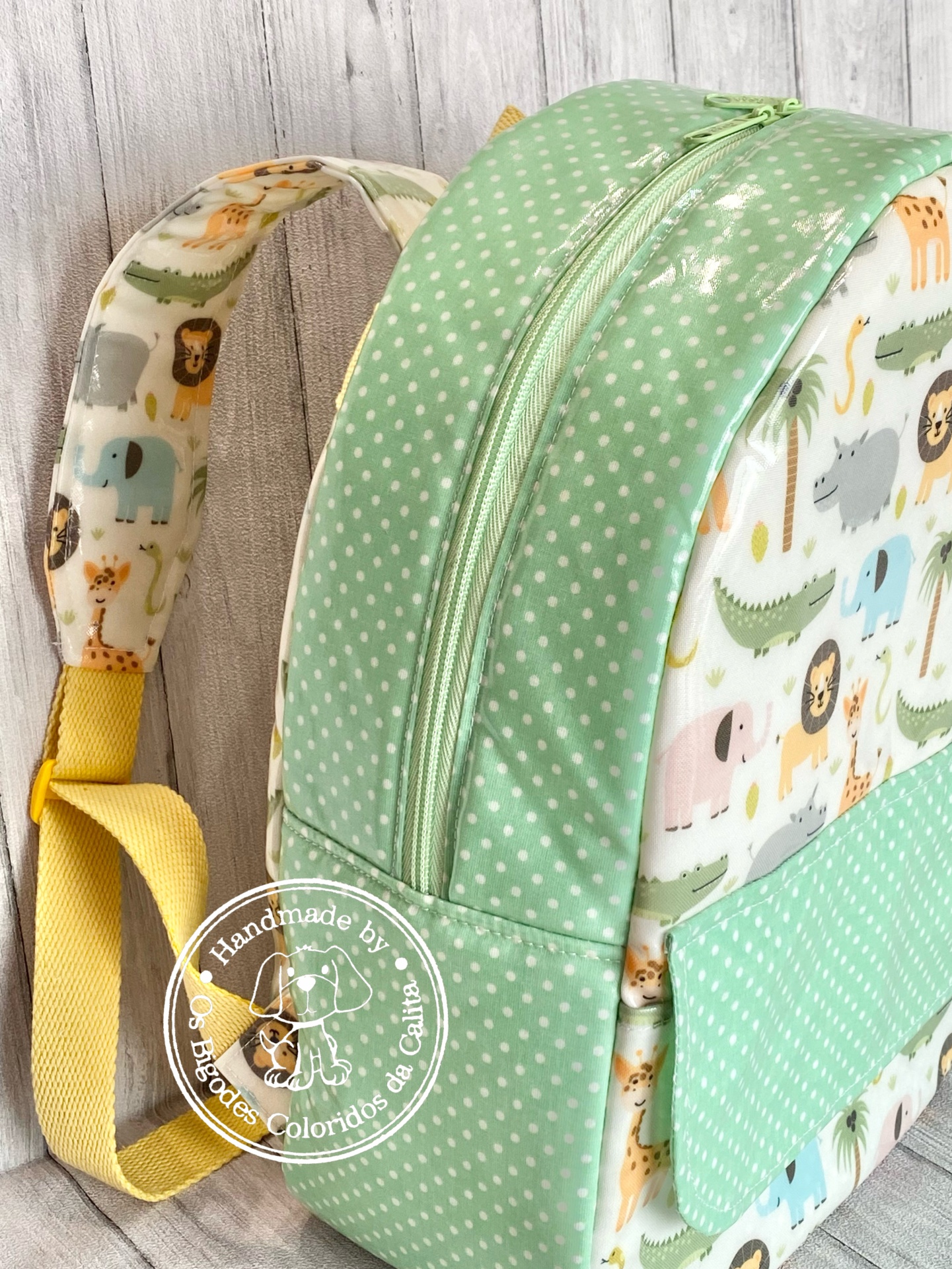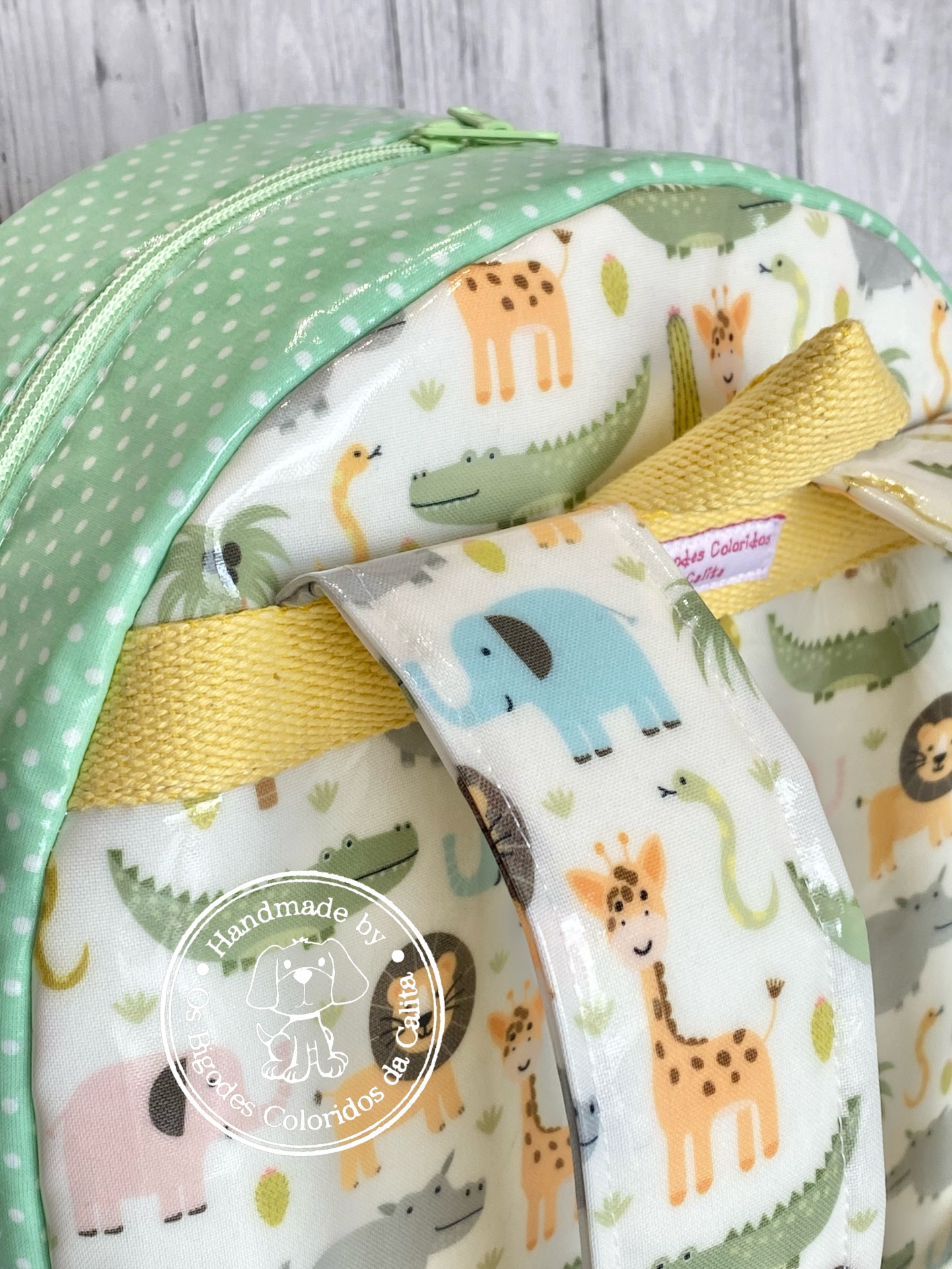 Mochila de tecido plastificado no exterior e tecido de algodão no interior.