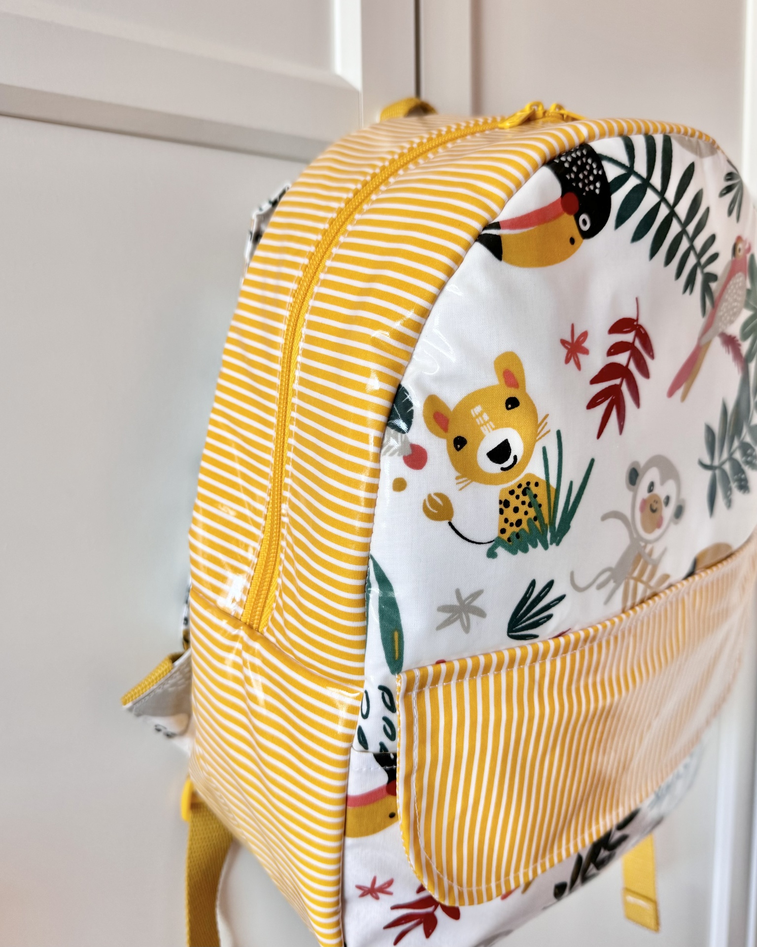 Mochila de tecido plastificado no exterior e tecido de algodão no interior.